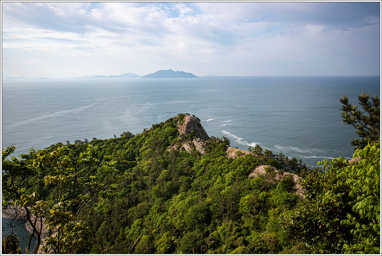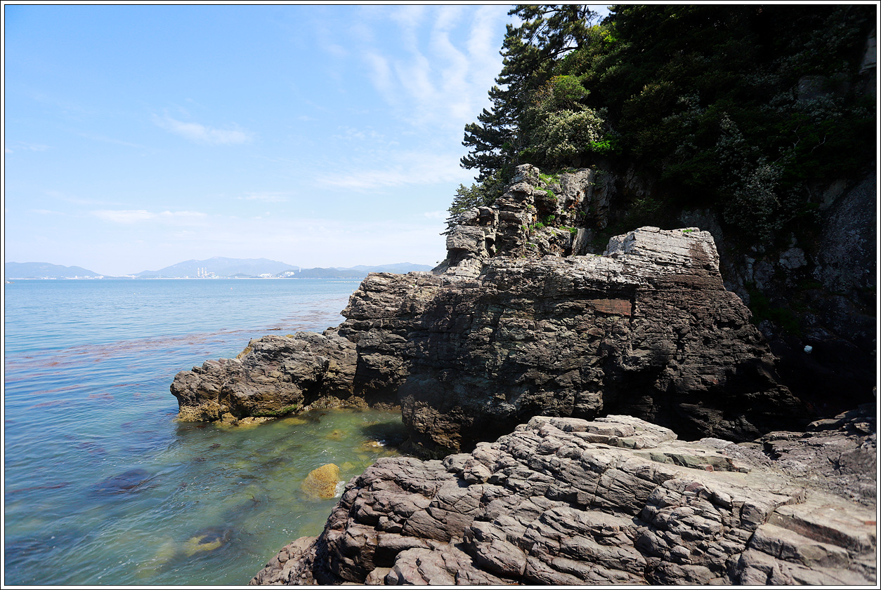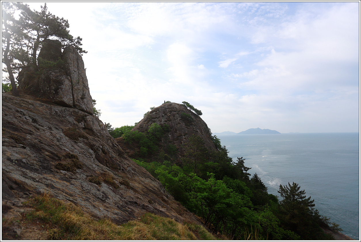 ▼ 첫 번째 답사지인 고래바위 가는 길에 보이는 매바위가 있는 풍경, 왼쪽 멀리 작게 추도가 보이고 오른쪽으로는 마치 욕지도와 연결된 듯 한 두미도가 보인다.