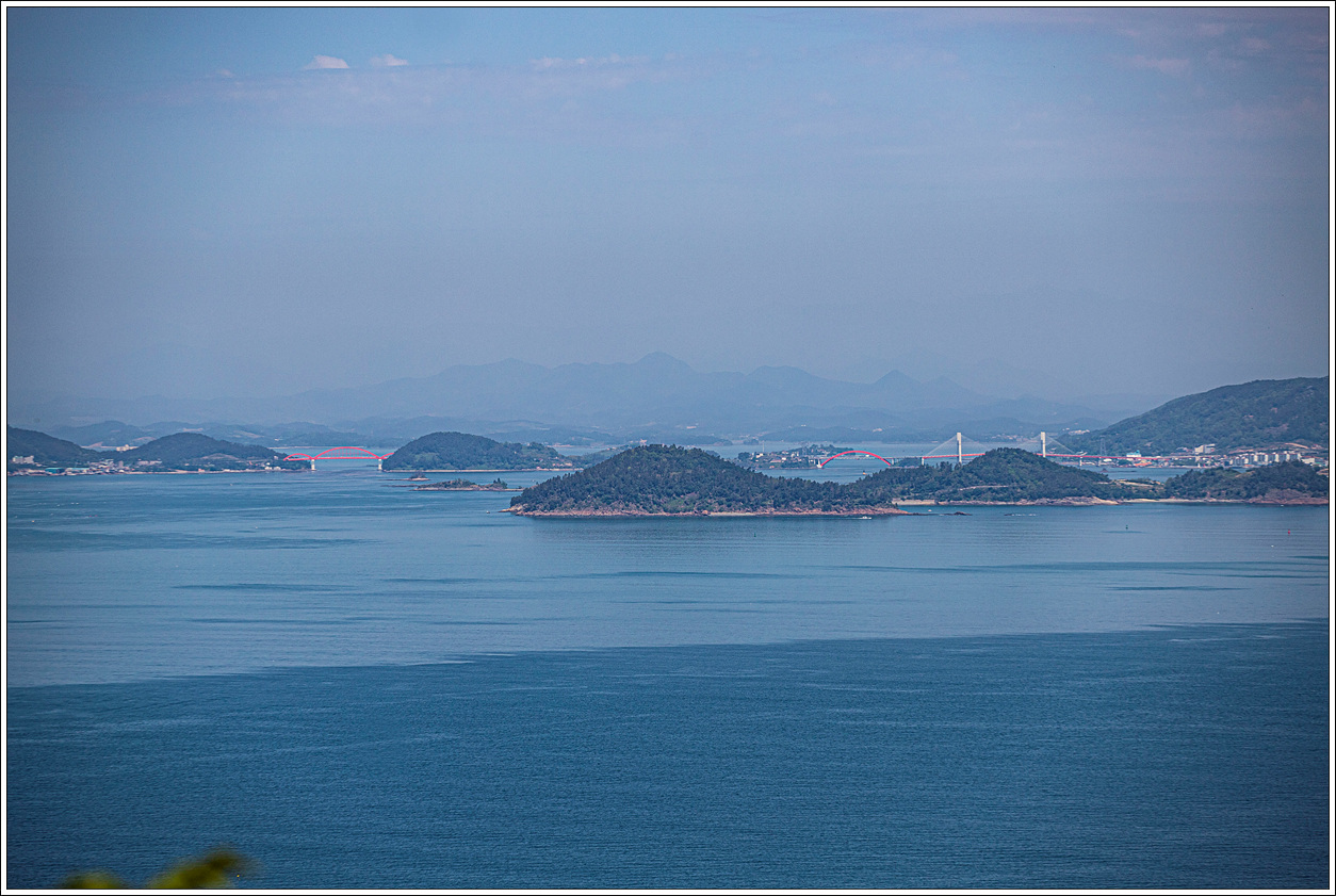 ▼ 삼천포에서 왼쪽 창선도까지 이어진 다리는 4개이다. 첫 번째 주탑이 있는 다리는 모개도와 연결된 삼천포대교, 두 번째 빨간색 교각은 모개도에서 초양도를 잇는 초양대교, 세 번째 다리는 늑도와 연결된 늑도대교, 마지막 네 번째 빨간색 교각은 늑도에서 창선도를 잇는 창선대교이다. 세 번째 다리인 늑도대교는 앞쪽 신수도의 대왕기산에 가려서 보이질 않는다.