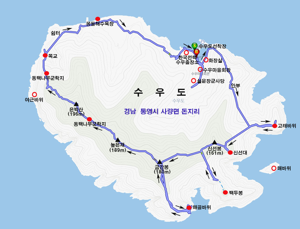 ♣ 산행코스: 선착장-고래바위-신선봉-백두봉-금강봉-해골바위-은박산-몽돌해수욕장-선착장