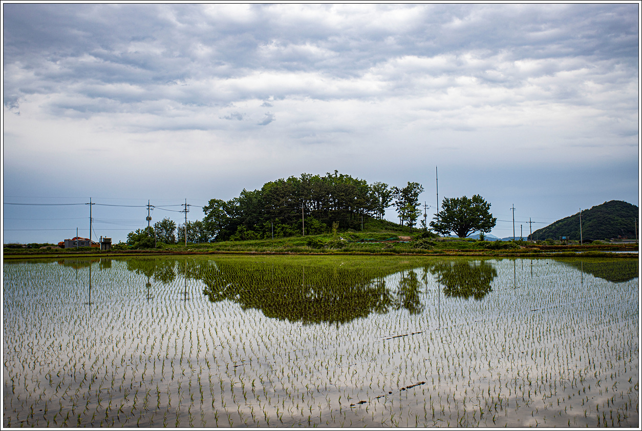 모내기 직전의 논에 물을 댄 상태로 반영된 풍경이 이채롭다.