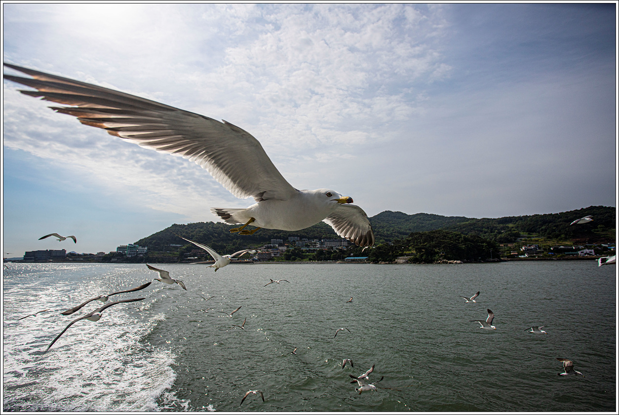 ▼ 갈매기는 승선객들이 주는 먹이에 익숙해져 있어 먹이 활동을 제대로 하는지 모르겠다. 먹이를 던져 주는 것이 아니라 손에 쥐고 쳐들고 있으면 낚아 챌 정도니 사람에 대한 두려움도 이젠 없어진 듯 하다.