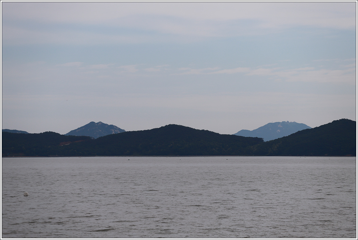 ▼ 석모도 서쪽편의 상봉산에서 뻗어 내린 능선 사이로 왼쪽 멀리 석모도의 상주산과 오른쪽 강화도의 별립산을 렌즈로 당겨 봤다.