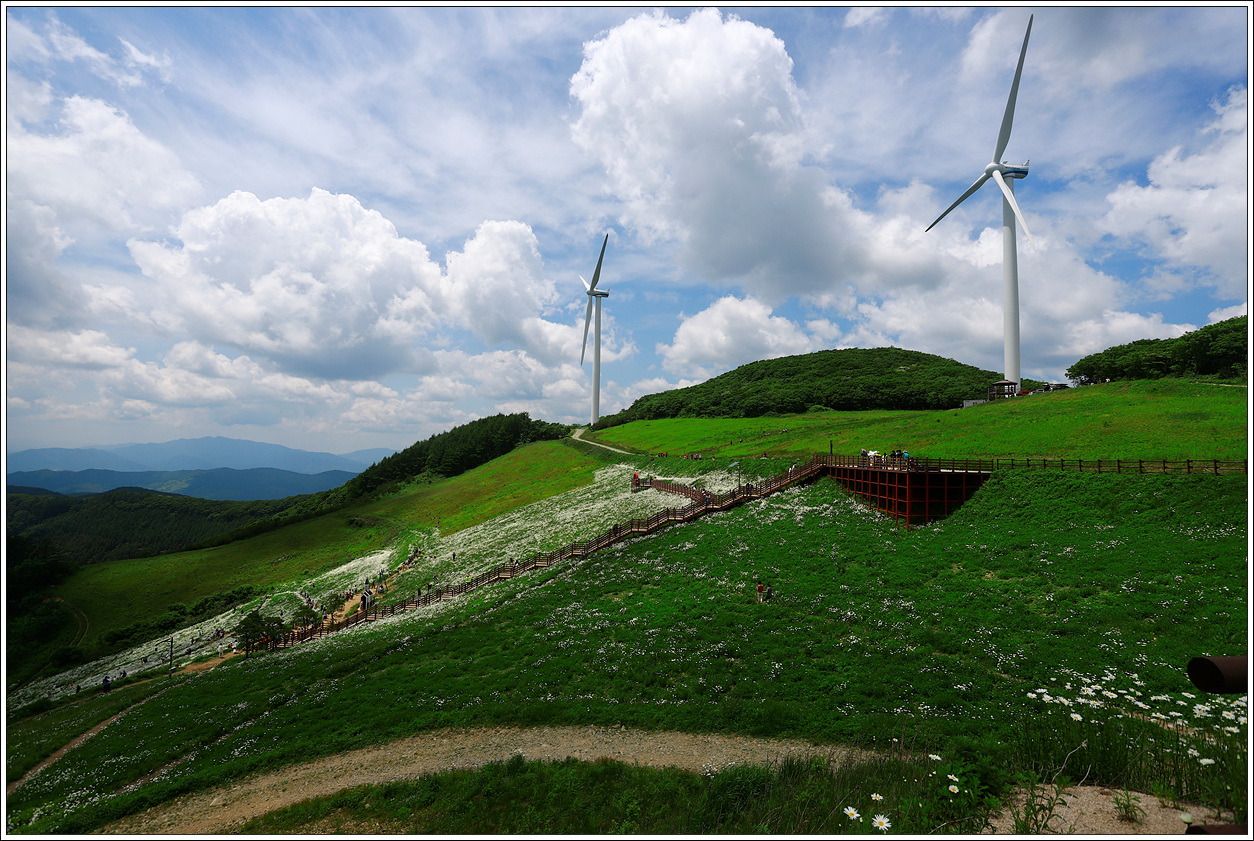 ▼ ‘육백마지기’라는 이름은 평지가 드문 강원도 산골에서 볍씨 600말을 뿌릴 수 있는 들판이라는 데서 유래됐다. 1960년대 초 고랭지 채소밭으로 개간돼 배추와 무 등을 재배했으나, 땅이 척박해져 언제 부터인지 샤스타데이지를 심어 이미지를 탈바꿈했다.