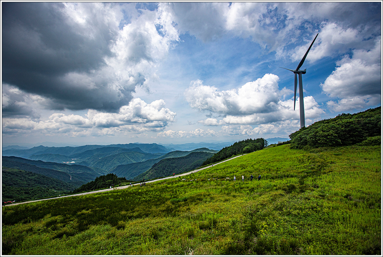 ▼ 드디어 풍력발전기가 일렬로 위용있게 자리잡은 육백마지기에 도착했다. 맑았던 하늘이 먹구름으로 뒤덮혔다.