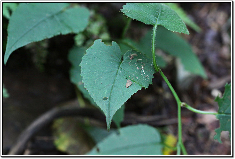 줄기잎은 달걀모양 또는 난상 3각형이고 끝이 뾰족하며 밑부분이 심장저 또는 절저이고 길이 10~15cm로서 양면에 털이 있으며 표면은 녹색이고 뒷면에 약간 흰빛이 돌며 가장자리에 날카로운 톱니가 있다.