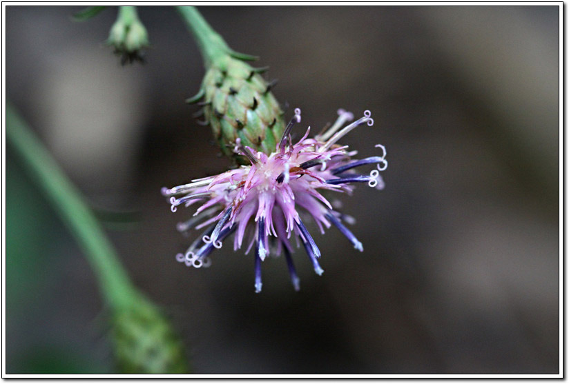 7~10월에 개화하며 자주색 통꽃만으로 이루어진 머리모양꽃차례고 원줄기 끝에 4~6개가 총상 비슷하게 달린다. 총포는 종형이고 끝이 약간 좁으며 길이 15~18mm, 나비 9~12mm로서 밑부분이 둥글고 포편은 7~10줄로 배열하며 내편이 외편보다 4~5배 길고 외편은 넓은 달걀모양으로서 흑색이며 뒤로 젖혀지며 중편은 장타원형이고 내편은 선형이며 자줏빛이 돌고 뒷면에 거미줄 같은 털이 있다. 꽃부리는 자주색이며 길이 14~16.5mm이다. [국가생물종지식정보시스템]