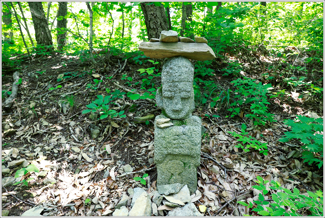 ▼ 멧돼지 물먹는 자리라는 안내판을 지나니 옛 묘지 자리 터라는 안내판에 이와 같은 앙증맞은 석상이 세워져 있고 누군가 짓궂게 머리에 돌들을 올려놔 삿갓을 쓴 것 같다. 언제 세워 놓은 석상인지 무덤은 흔적도 없고 잠시 인생이란 어느 날 안개와 같이 사라지고 한 줌의 흙으로 돌아가련만 매일을 번뇌에 살아가는 우리네 모습을 뒤돌아 보게 하는 시간이다.