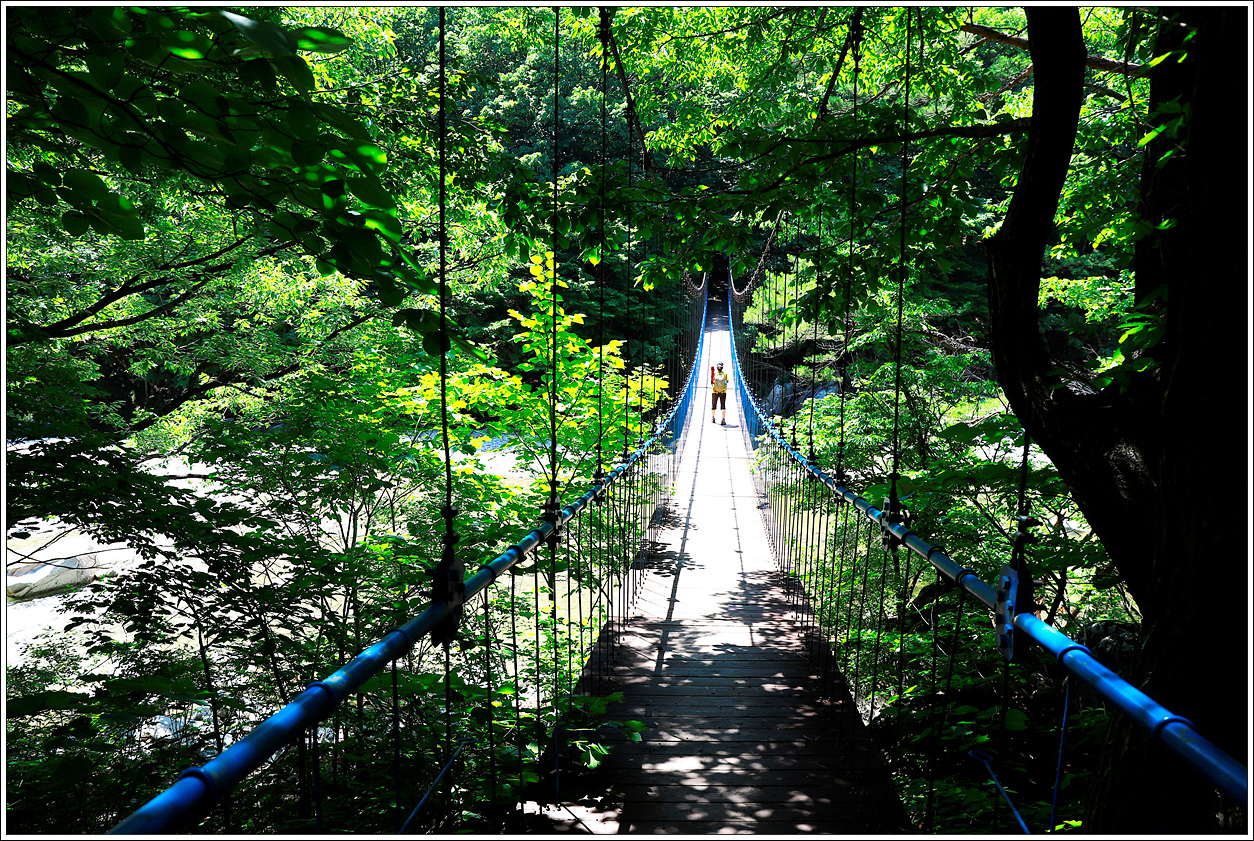 ▼ 소똥령 하늘다리가 북천을 가로질러 놓여있다. 출렁출렁 꽤나 요동치는 다리로 한꺼번에 20명 이상은 건너지 못하도록 안내가 되어 있다. 중간에 판자 한 개가 빠져 있는 등 보수를 해야 할 것 같다.