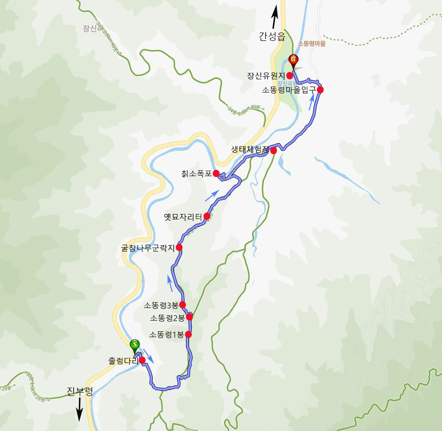 ♣ 산행코스: 진부리 소똥령들머리-구름다리-소똥령1,2,3봉-칡소폭포-생태체험장-소똥령마을-장신유원지쉼터 주차장