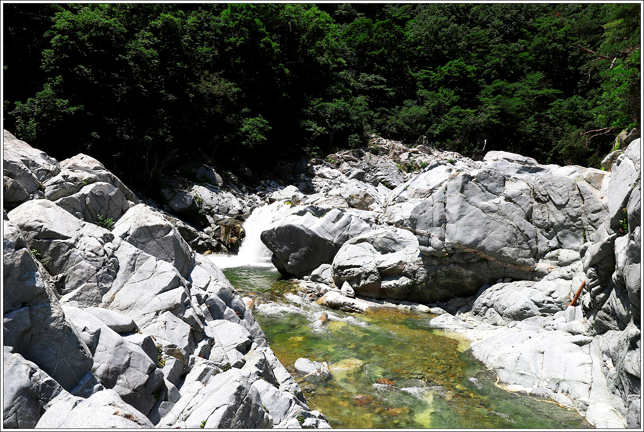 ▼ 북천의 넓이나 바위의 상태를 보니 엄청난 계곡의 천(川) 임을 알 수가 있다. 신선봉 북쪽의 마산봉과 왼쪽 향로봉 사이의 즉, 진부령 아래에서 시작되어 간성읍 쪽으로 해서 동해안으로, 남에서 북쪽 방향으로 흐르는 계곡물이다.