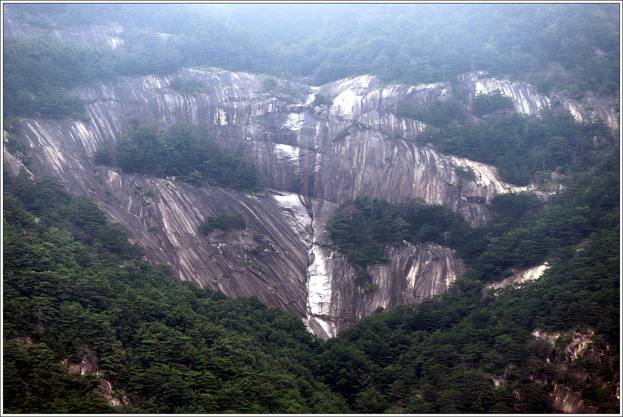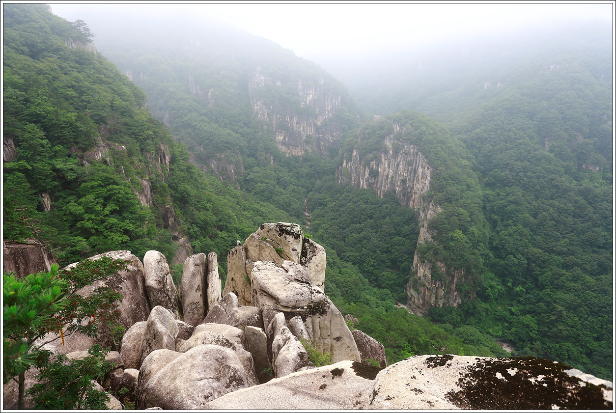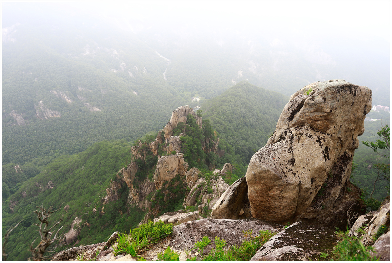 ▼ 두번째 바위전망대에 올랐다. 날씨가 금방 빗방울이라도 떨어질 것 같은 날씨라 칙칙하기로 이를 데 없다. 산뜻한 날이었다면 얼마나 좋았으랴! 맞은편 왼쪽 느루봉(1,142m)에서 흘러 내린 능선 사이로 중대폭포가 눈에 들어왔다.