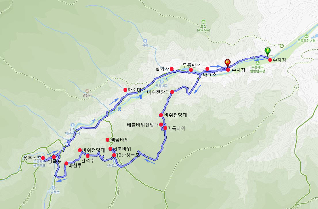 ♣ 산행코스: 주차장-매표소-베틀바위전망대-미륵바위-수도골-12산성폭포-마천루전망대-쌍폭-용추폭포-학소대-삼화사-주차장