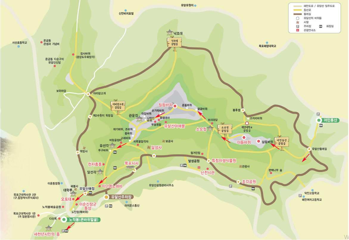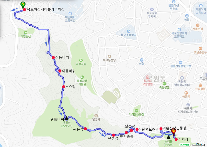 ♣ 산행코스: 목포해상케이블카주차장-삼등바위-이등바위-소요정-얼굴바위-일등바위(정상)-관운각-고래바위-유선각