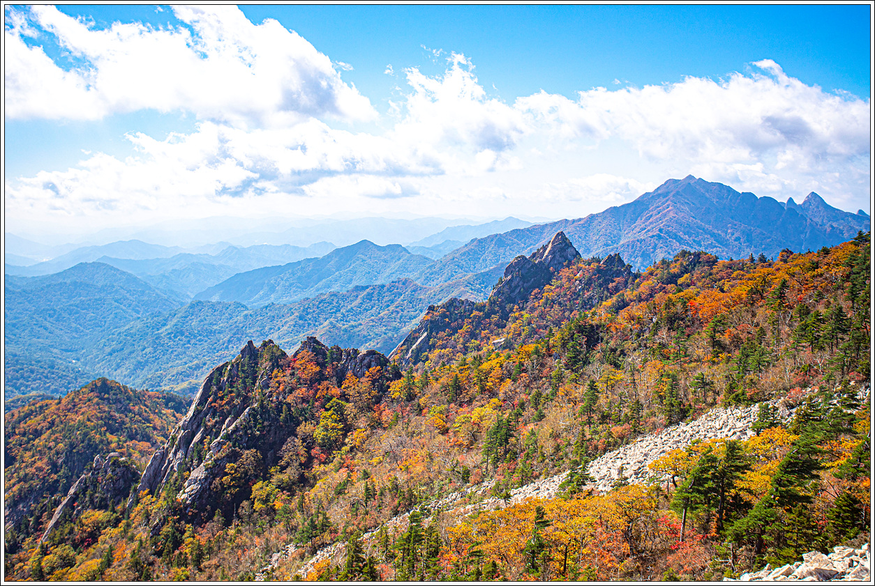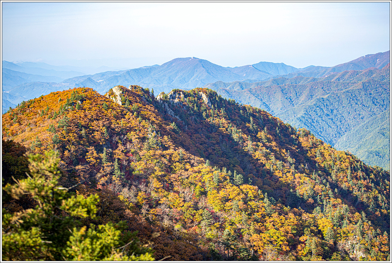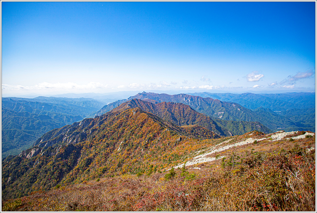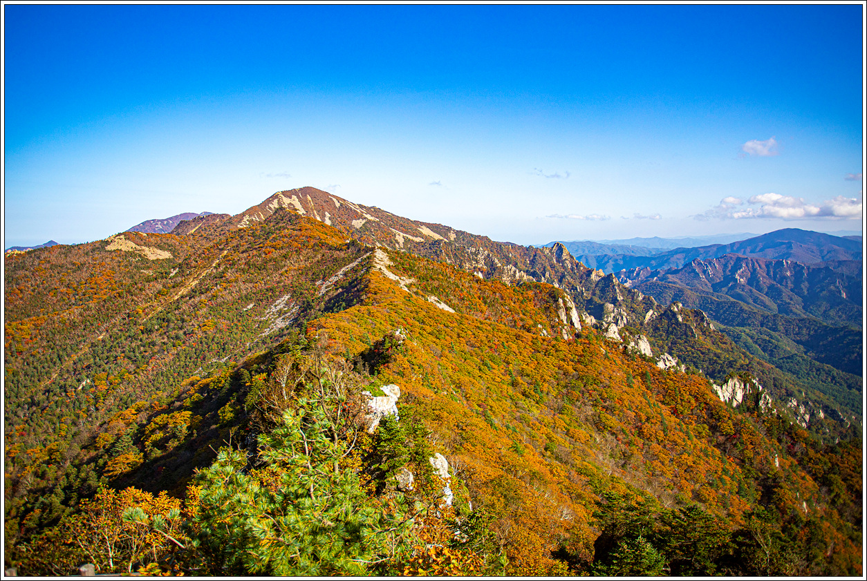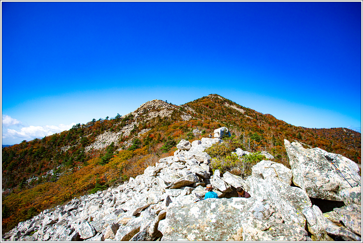 ▼ 왼쪽 멀리 점봉산과 함께 암릉과 기암괴석이 단풍과 함께 한폭의 산수화가 따로 없는 풍경이다.