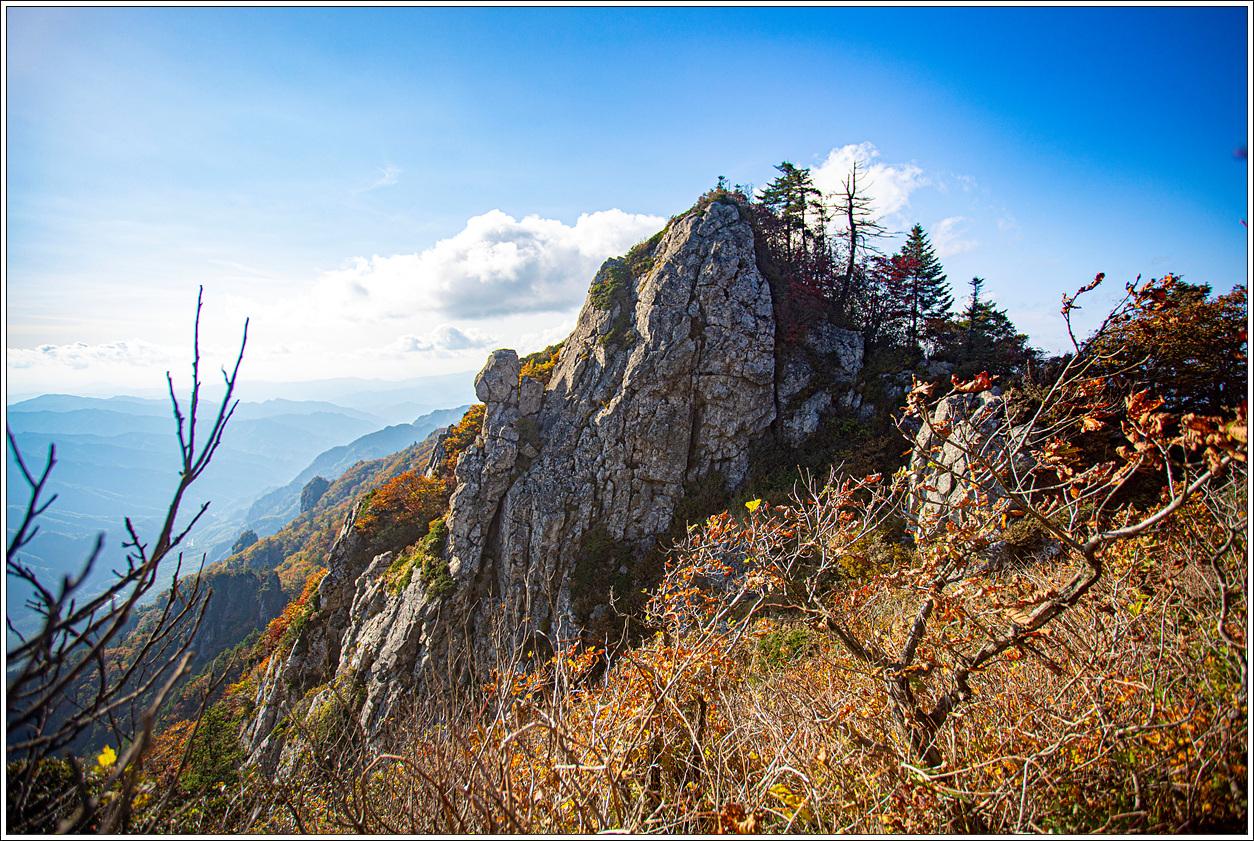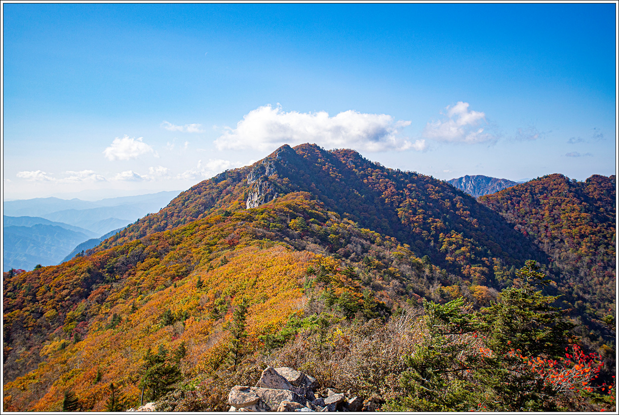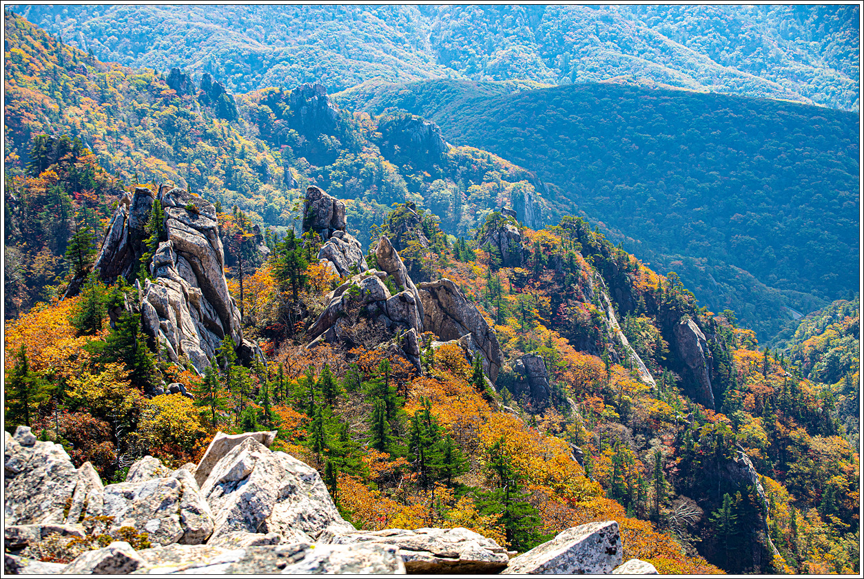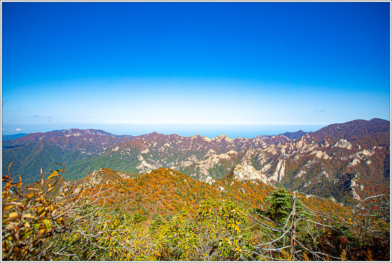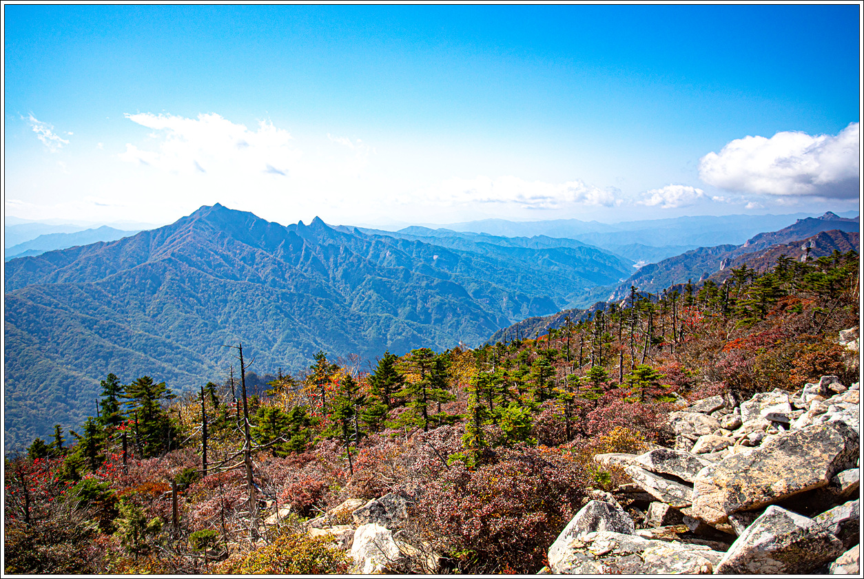 ▼ 왼쪽 멀리 점봉산과 함께 암릉과 기암괴석이 단풍과 함께 한폭의 산수화가 따로 없는 풍경이다.