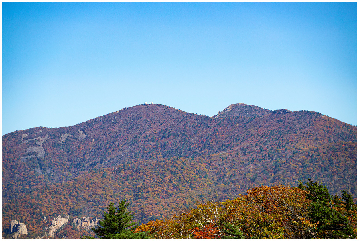 ▼ 북쪽의 향로봉(1296m)이 렌즈에 잡혔다. 그 왼쪽 뒷편으로 북한의 금강산이 보인다.