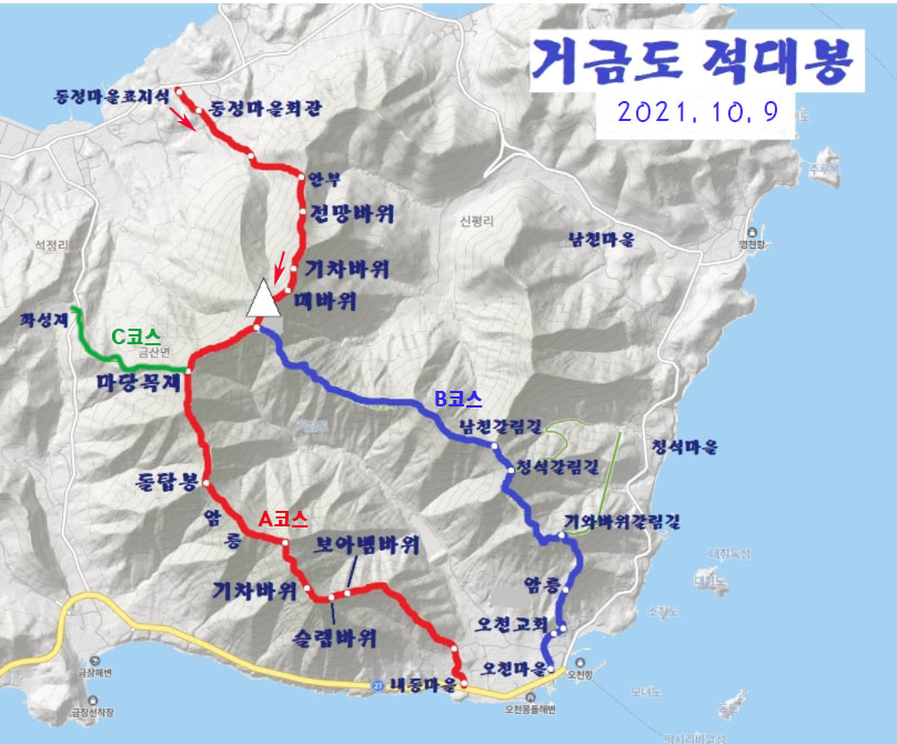 ▽ 이렇게 해서 그동안 또 숙제로 남았었던 거금도 적대봉을 어렵사리 올라 목표치 50개 중 42번째로 해결했다. 비록 교통체증으로 버스가 제시간에 들머리에 도착 못하여 계획대로 종주는 하지 못했지만 기대했던 주변 조망을 하며 그런대로 여유로운 산행을 마쳤다. 버스로 왕복 11시간을 넘게 기록적인 시간을 보냈지만 후회될 것은 없다. 어느 회원은 두번씩이나 이곳을 올랐고 어느 회원은 다시는 이곳에 와 볼 일이 없다고 하니 각자의 생각이 다르다. 자연이란 그저 있는 그대로일 뿐, 사람 생각만 다를 뿐이다. 이곳에 왔고 나름 즐기면 그만 아니었겠는가!