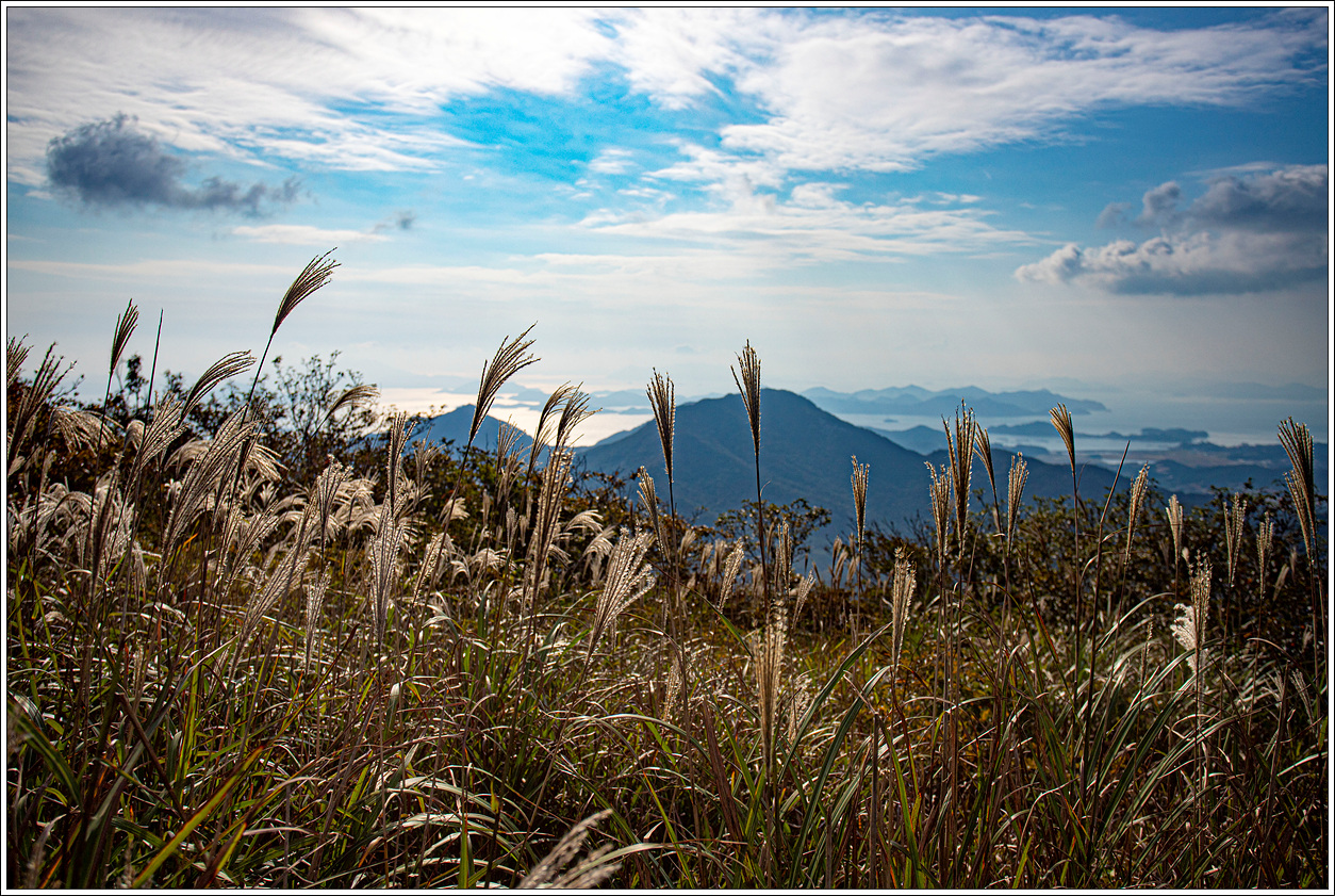 ▽ 서쪽 방향으로 멀리 금당도와 역시 블야에서 정한 100대 섬에 포함된 오른쪽 작고 길게 보이는 연홍도의 풍경이 들어오면서 억새는 서쪽으로 넘어가는 햇살에 은빛을 발하여 가을정취를 듬뿍 안겨주고...