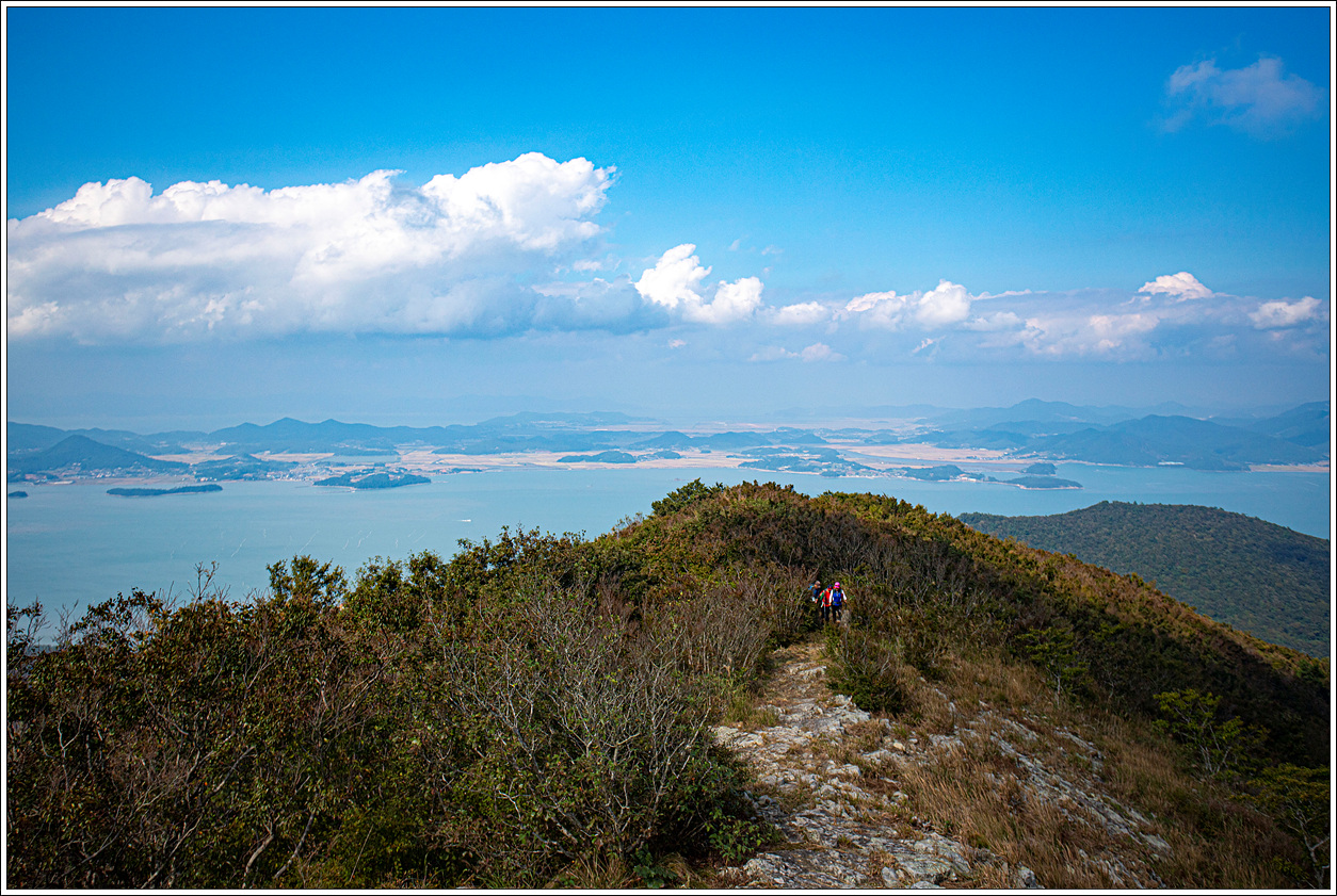 ▽ 계획상으로는 왼쪽능선을 경유, 오천항쪽으로 하산하는 것이 B코스였는데 28명 중 단 한명도 희망자가 없어서 오른쪽 능선으로 해서 내동마을로 하산하는 A코스를 타기로 했으나 버스가 1시간이나 늦게 도착하는 바람에 거의 달리다 시피 두세개 봉우리를 경유하여 하산하지 않으면 마감시간까지 어렵게 됐다.