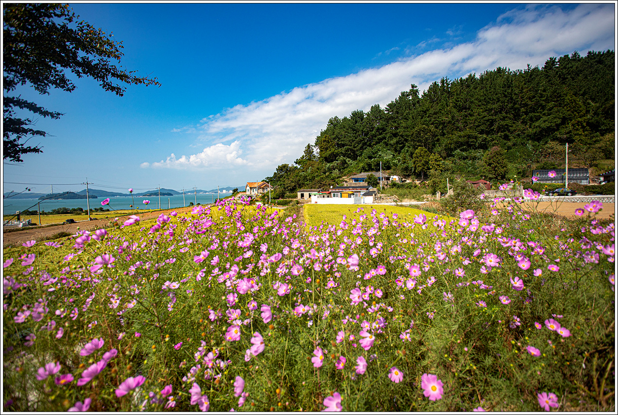 ▽ 코스모스 한들 한들 피어있는 길에 황금색 들녘과 바다가 어우러진 풍경이다. 요즘 코스모스는 키도 작고 무늬와 색깔도 다양한 개량종이 심겨져서 어릴 적 부터 보아 왔던 것과 달라 이질감을 느껴 정이 안간다. 오랜만에 옛날 코스모스가 은은한 분홍색을 띠고 반긴다.