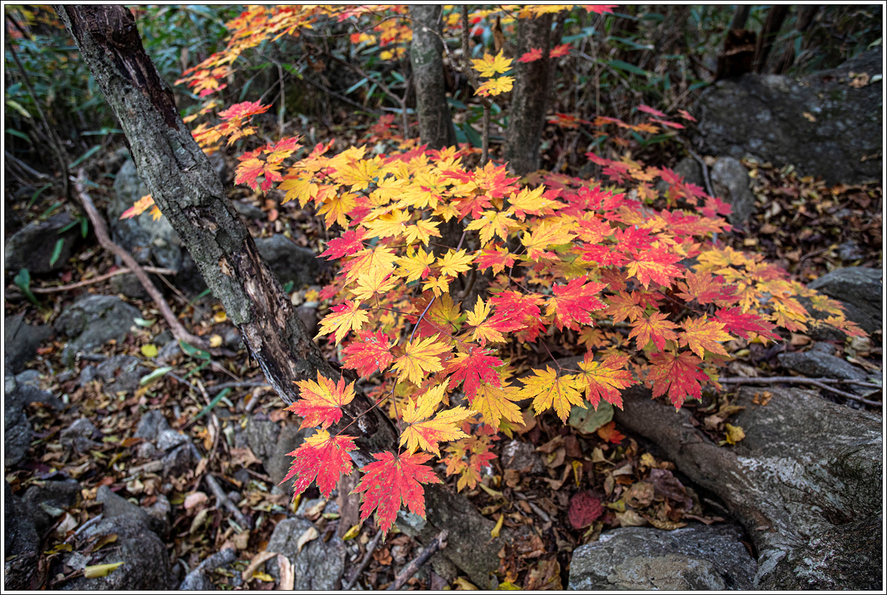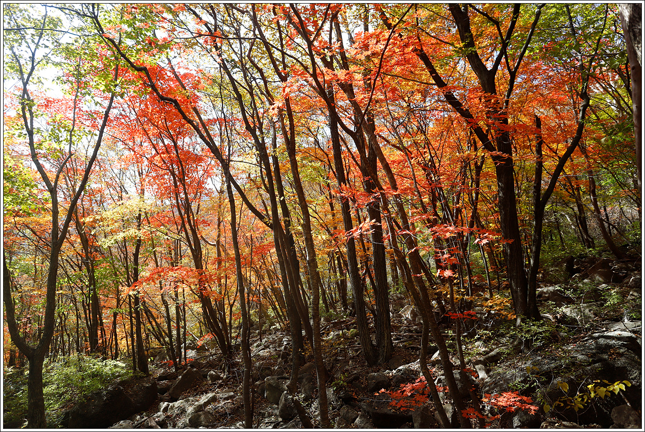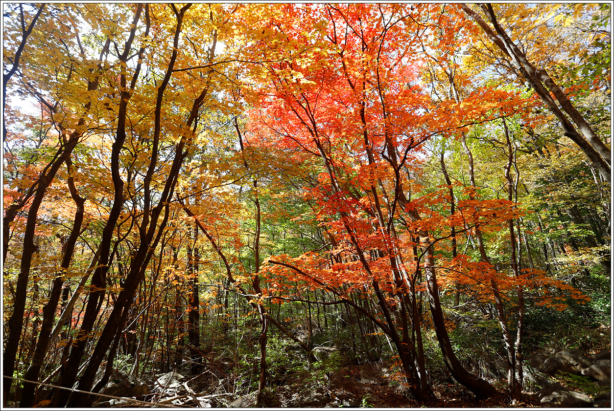 ▽ 단풍이 절정을 이뤘다. 계곡의 숲이 온통 붉어 등로까지 붉다. 봄, 여름 꽃산행 시기를 맞추기가 어렵듯이 가을 단풍산행 시기를 맞추기도 어려운데 모처럼 제철에 왔다.
