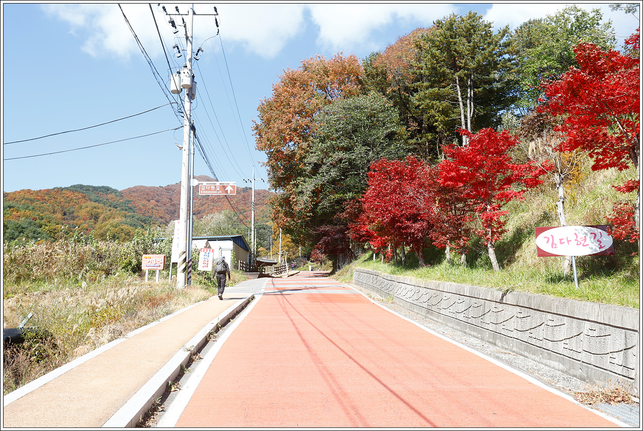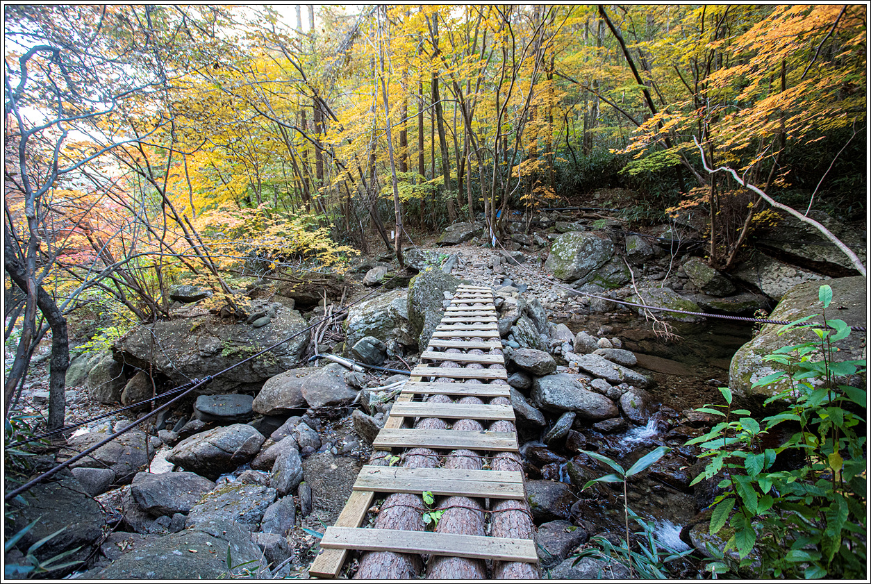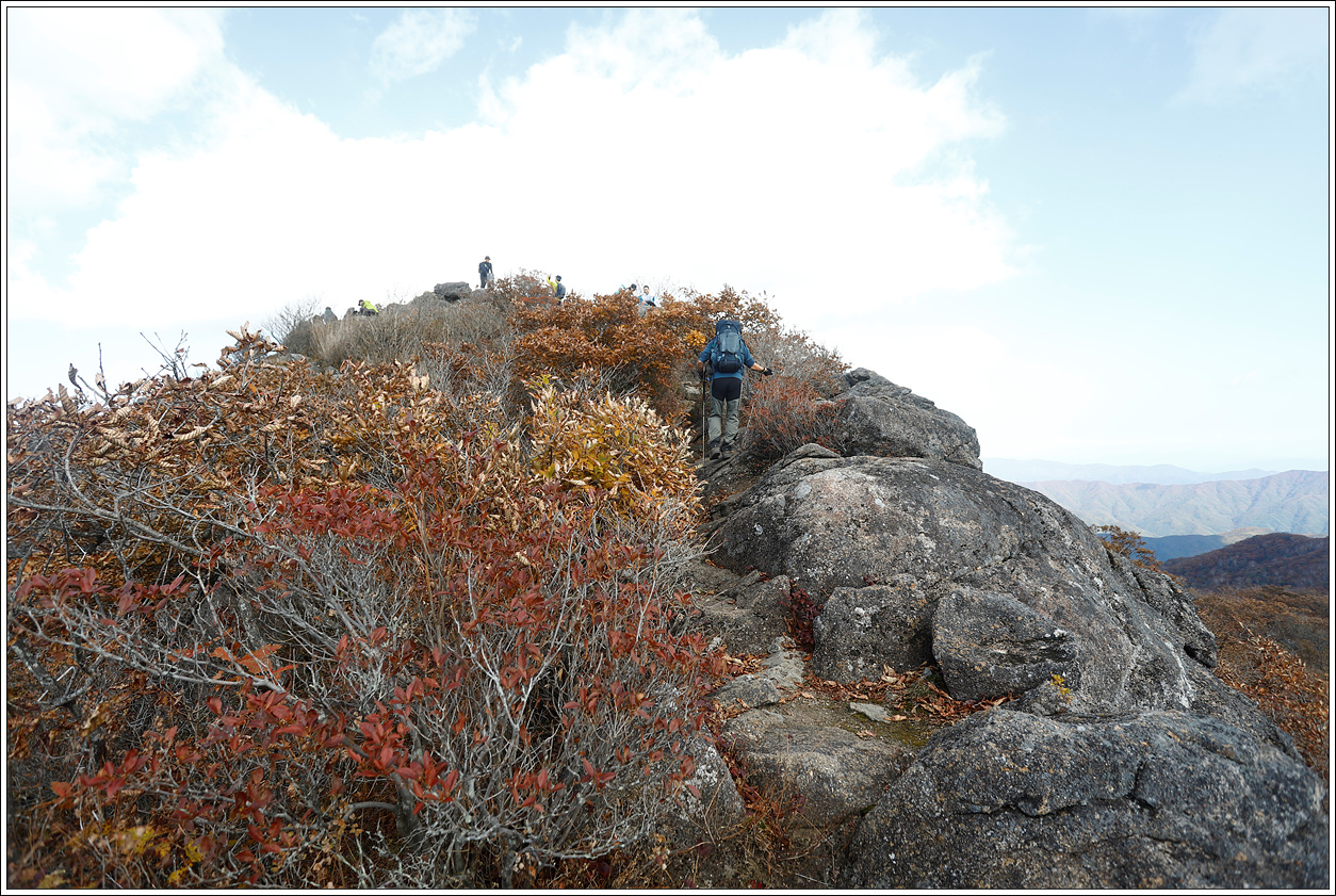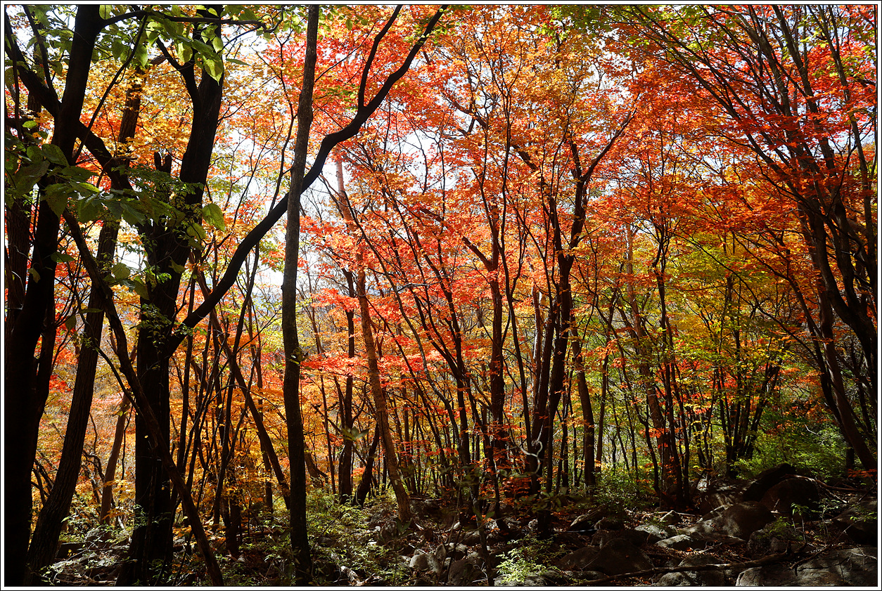 ▽ 단풍이 절정을 이뤘다. 계곡의 숲이 온통 붉어 등로까지 붉다. 봄, 여름 꽃산행 시기를 맞추기가 어렵듯이 가을 단풍산행 시기를 맞추기도 어려운데 모처럼 제철에 왔다.