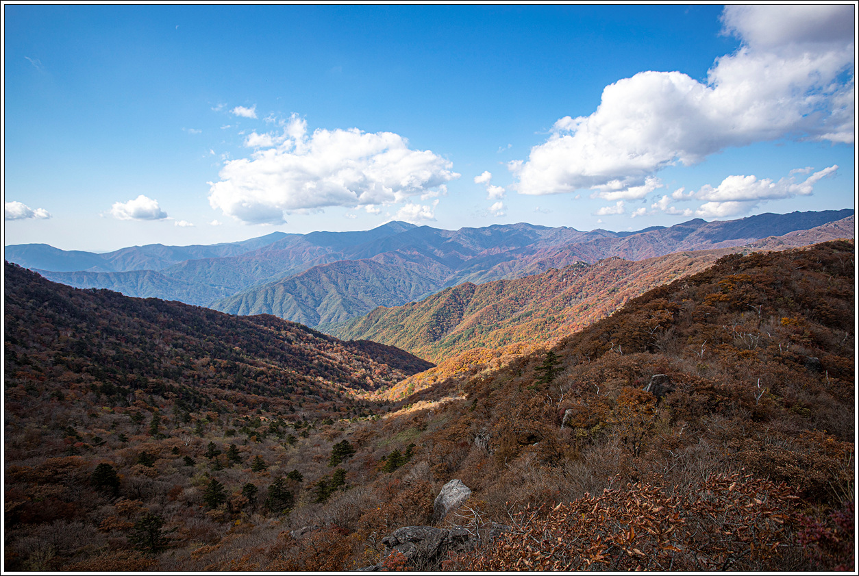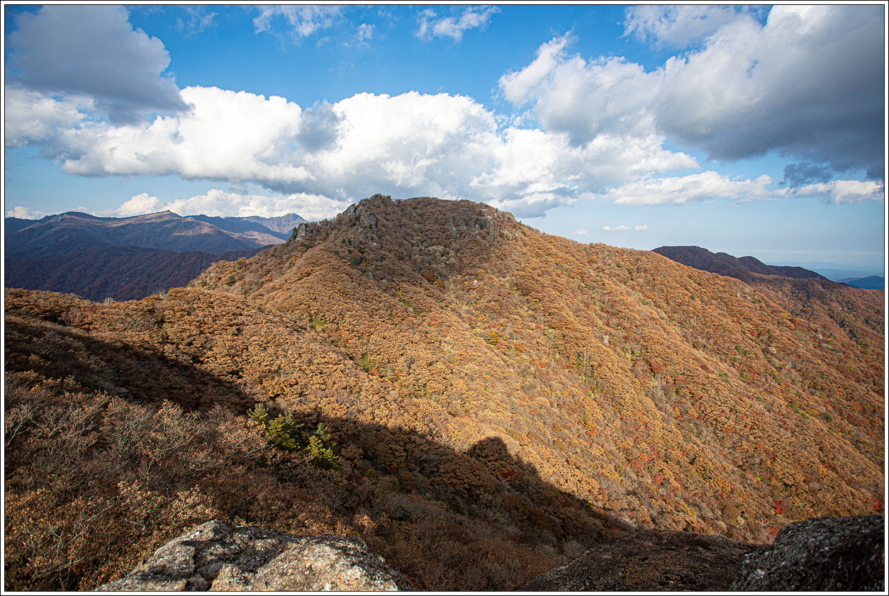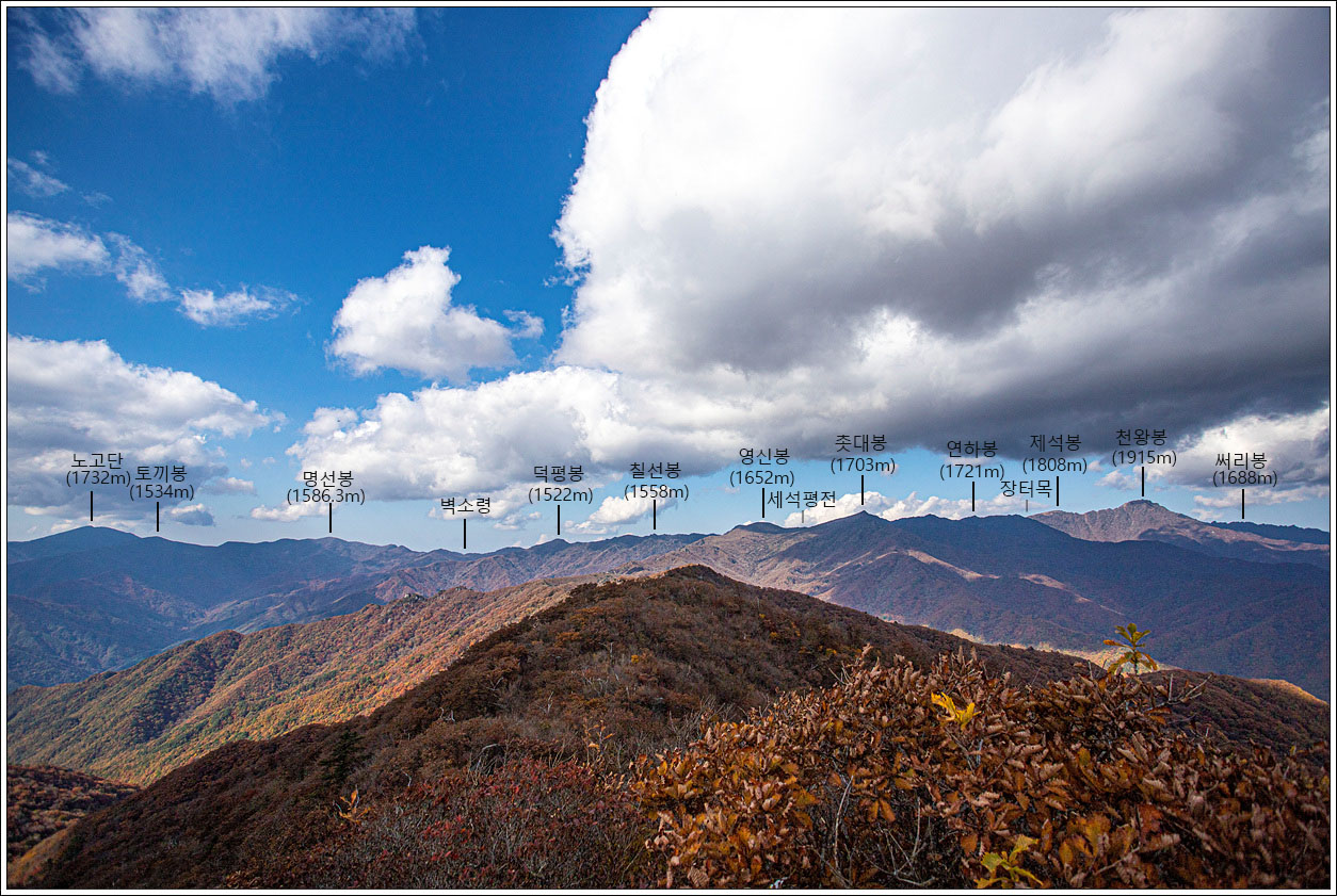 ▽ 이어서 가운데 촛대봉, 오른쪽 끝으로 천왕봉, 써리봉까지 조망해 본다. 계곡 아랫쪽으로 단풍이 잘 들어 있음을 볼 수 있다.