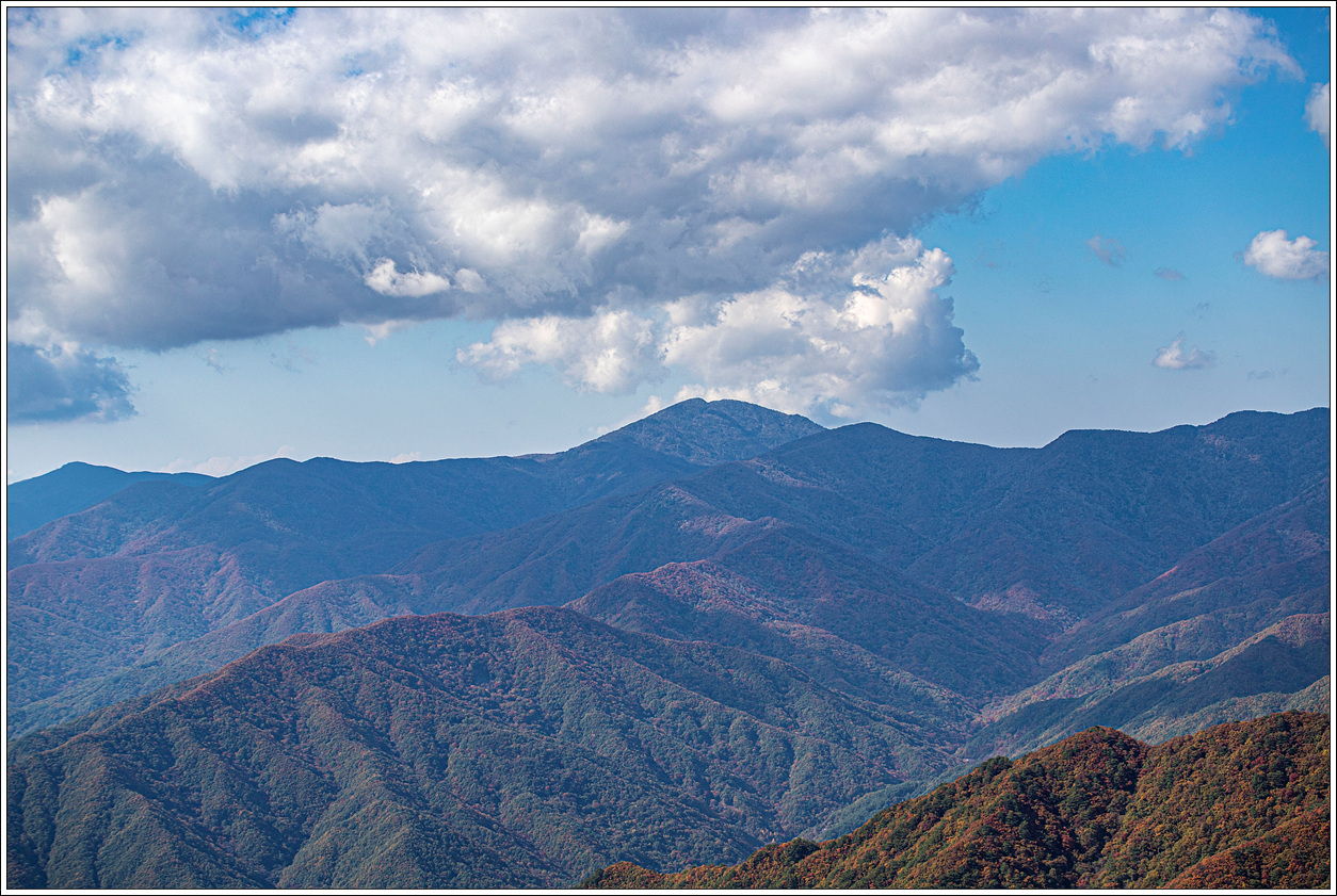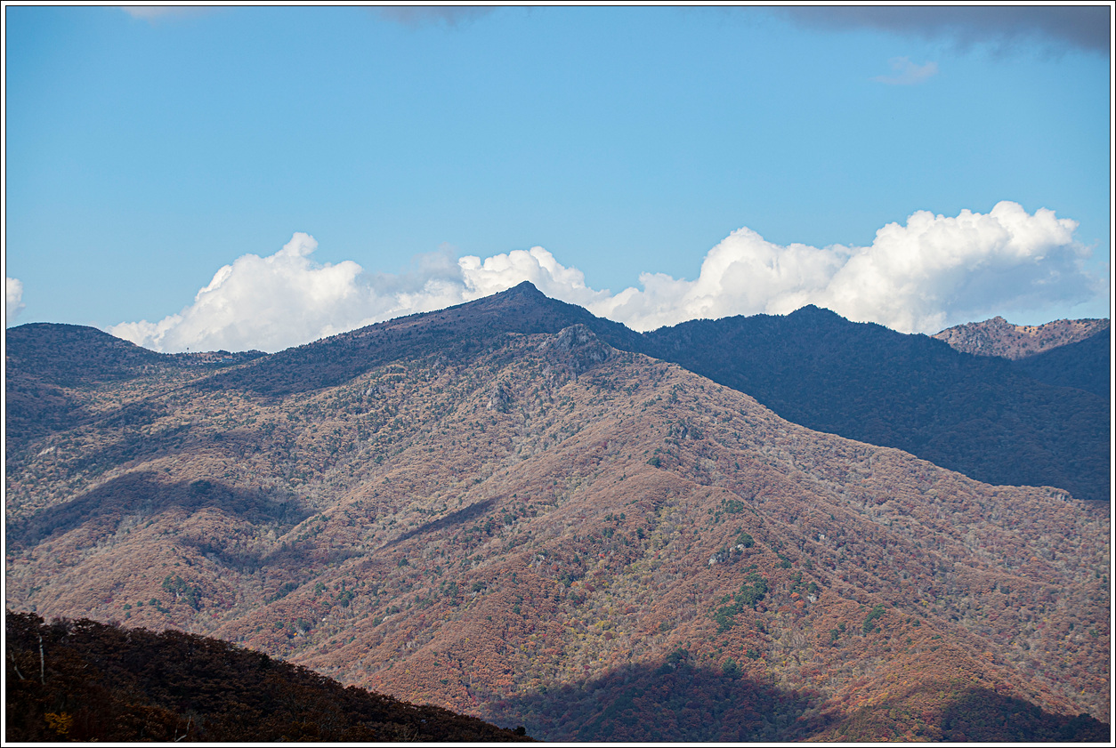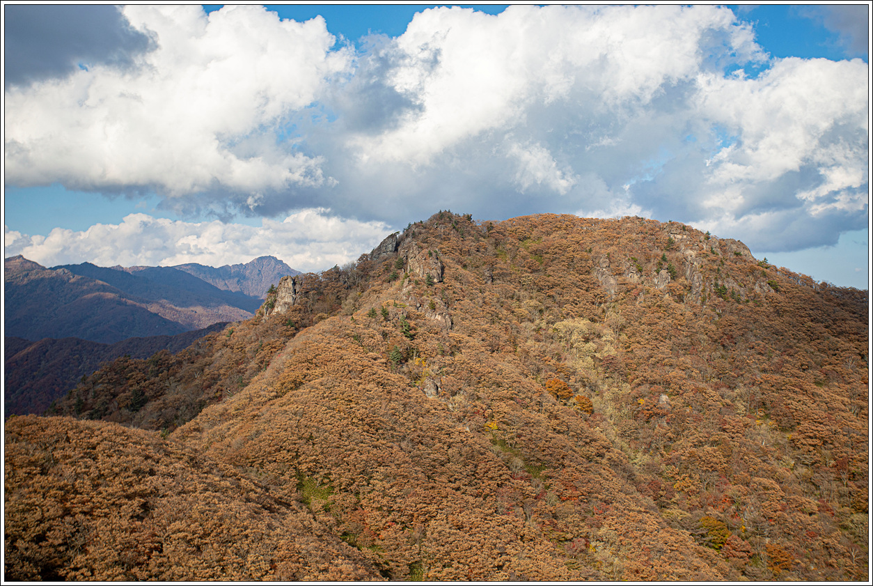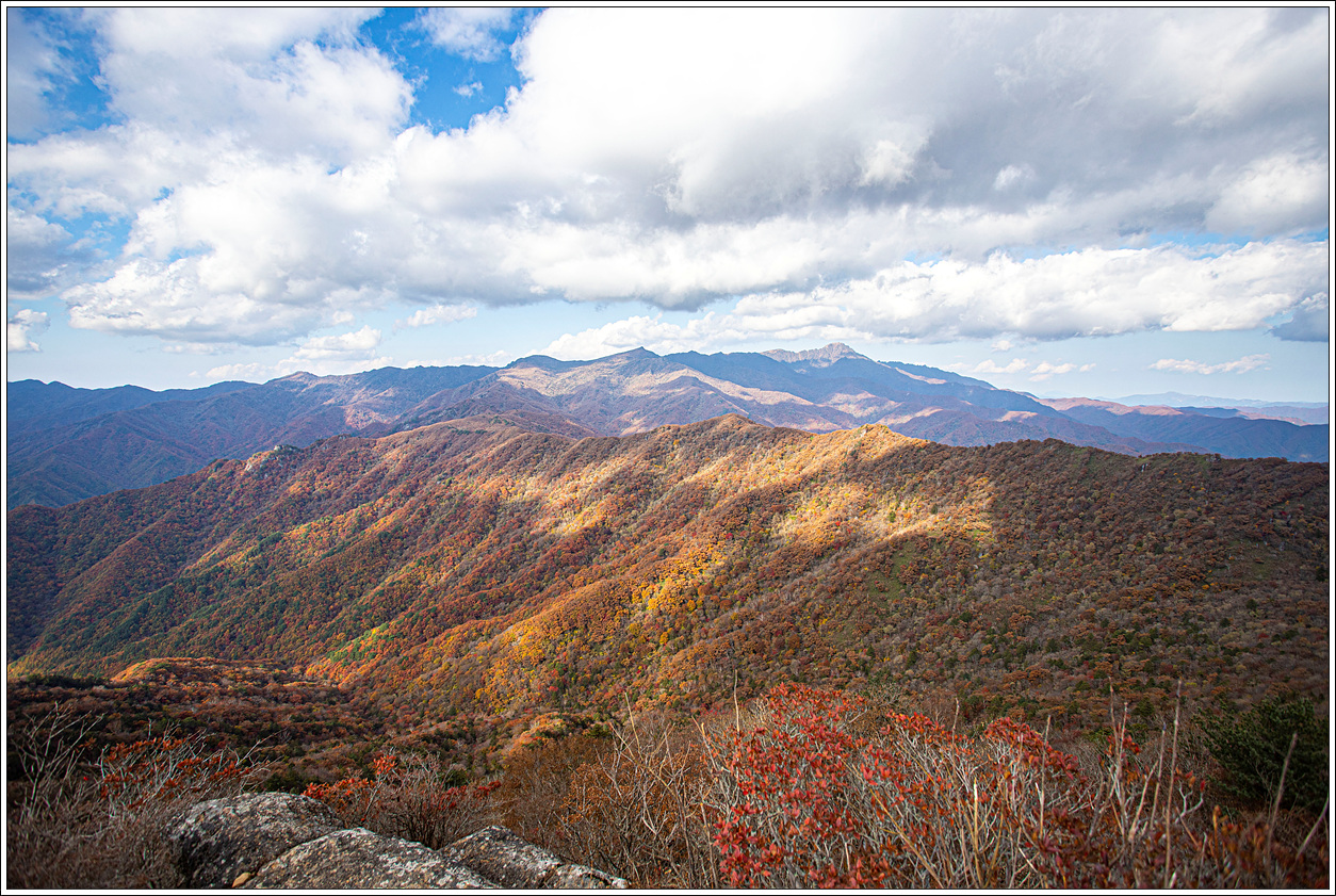 ▽ 이어서 가운데 촛대봉, 오른쪽 끝으로 천왕봉, 써리봉까지 조망해 본다. 계곡 아랫쪽으로 단풍이 잘 들어 있음을 볼 수 있다.