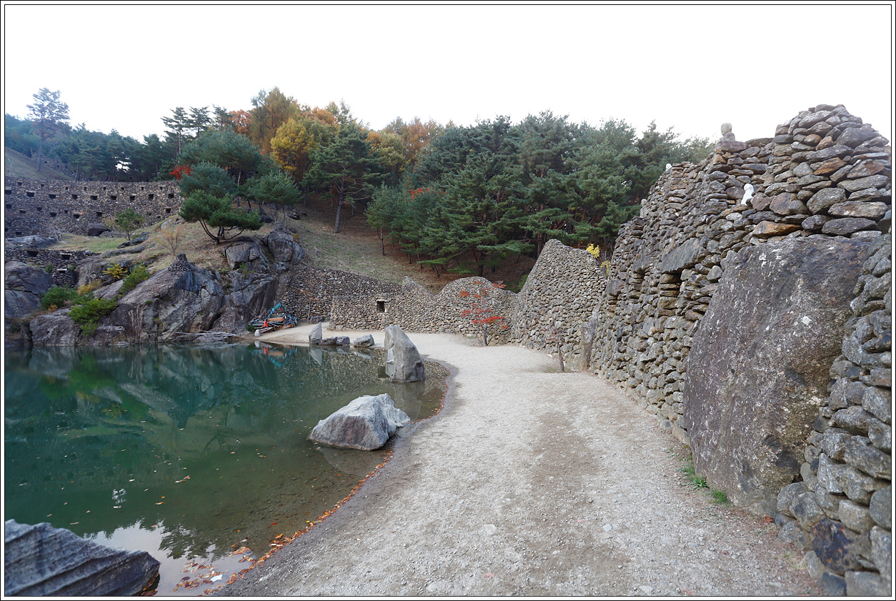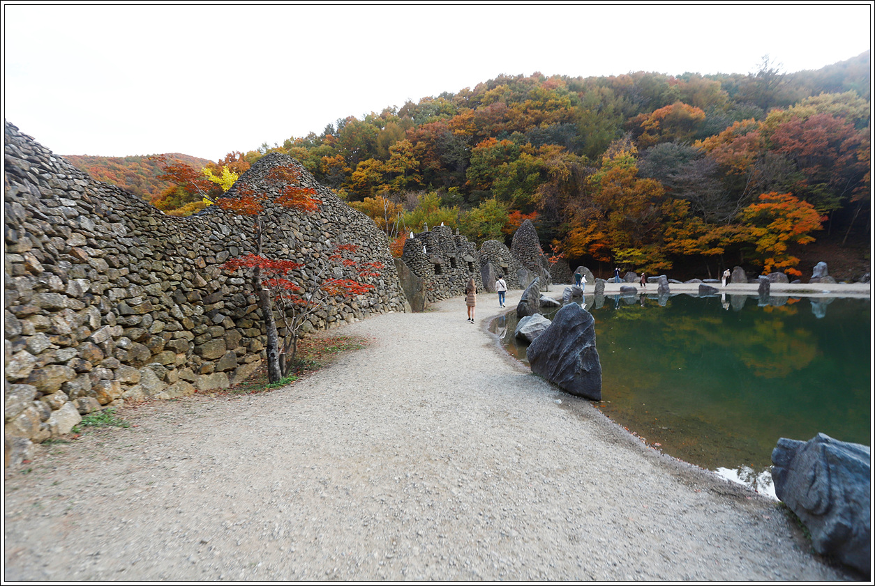 ▽ 삼성궁으로 가는 곳의 연못가로 이어진 돌탑과 조경용 암석들...