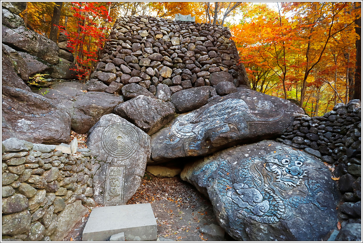 ▽ 평평한 제단처럼 보이는 반듯한 돌이 놓여져 있고 왼편에는 호랑이, 오른편 바위에는 용과 거북이 바위에 새겨져 있다.