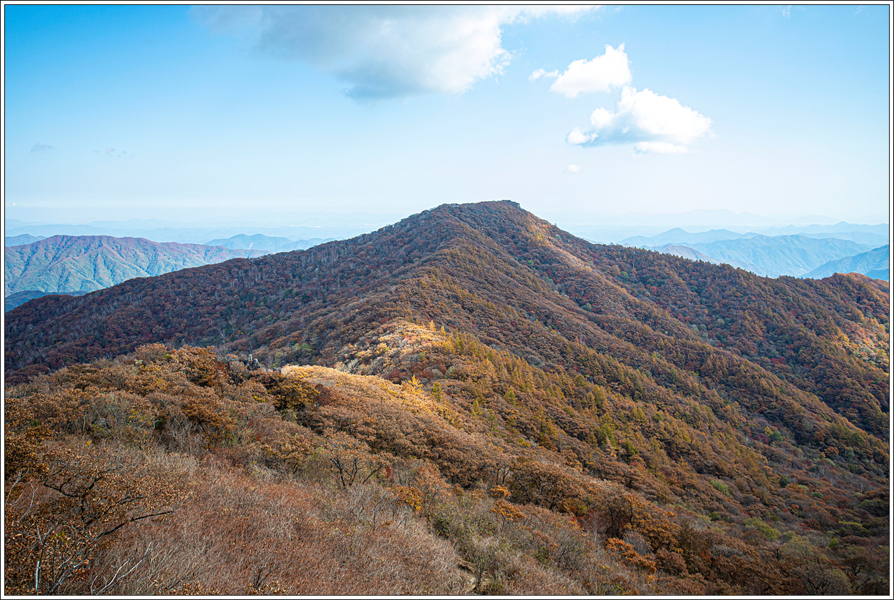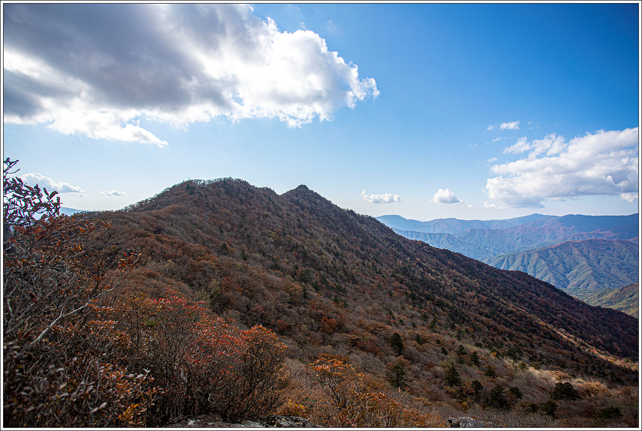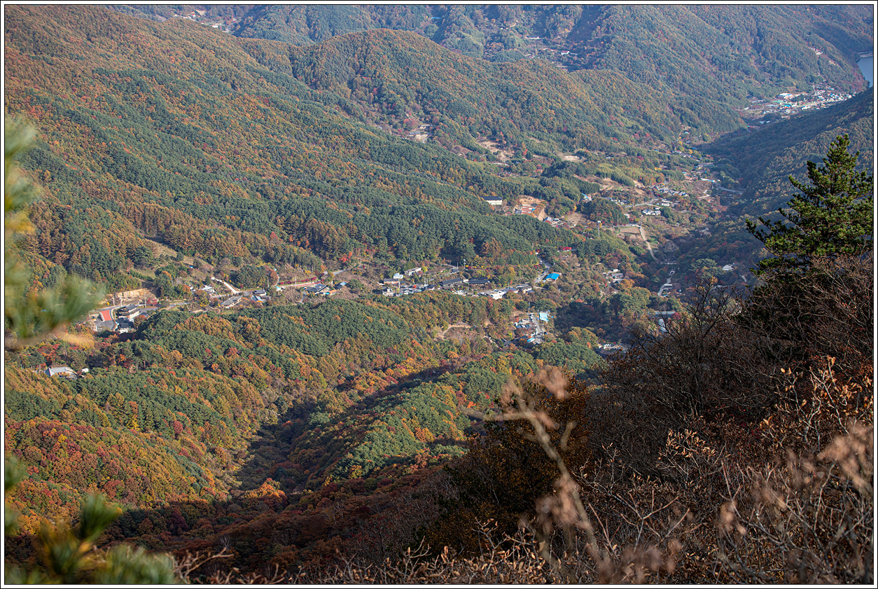 ▽ 외삼신봉에서 뻗어 내린 능선과 계곡의 단풍은 벌써 퇴색되어 간다.
