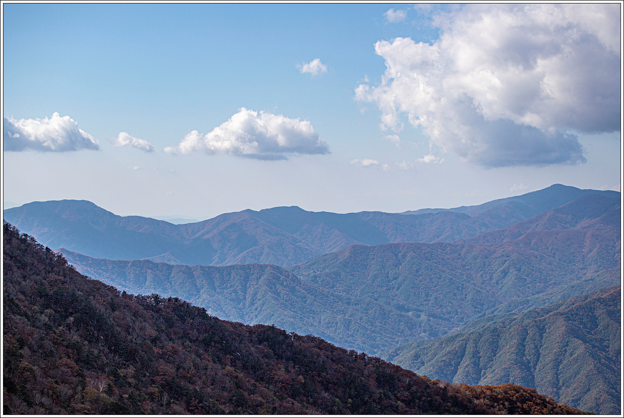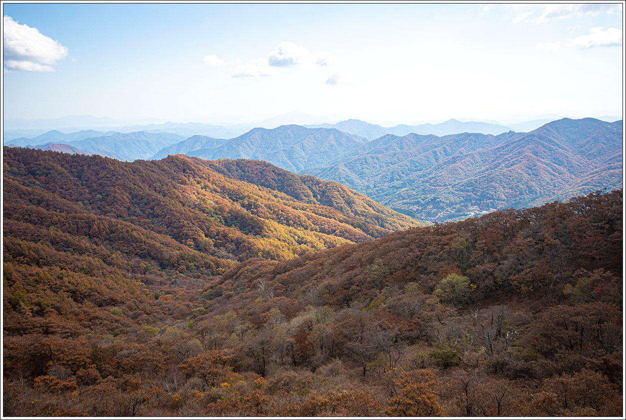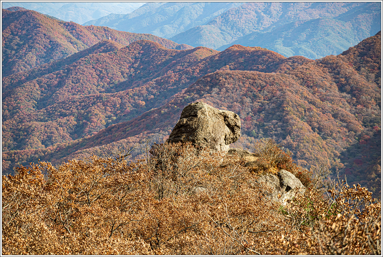 ▽ 외삼신봉에서 뻗어 내린 능선과 계곡의 단풍은 벌써 퇴색되어 간다.