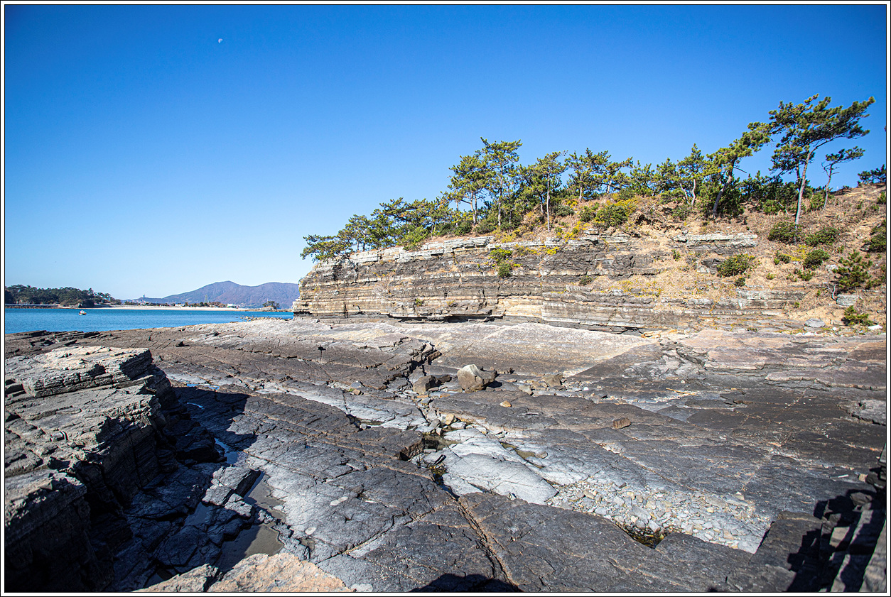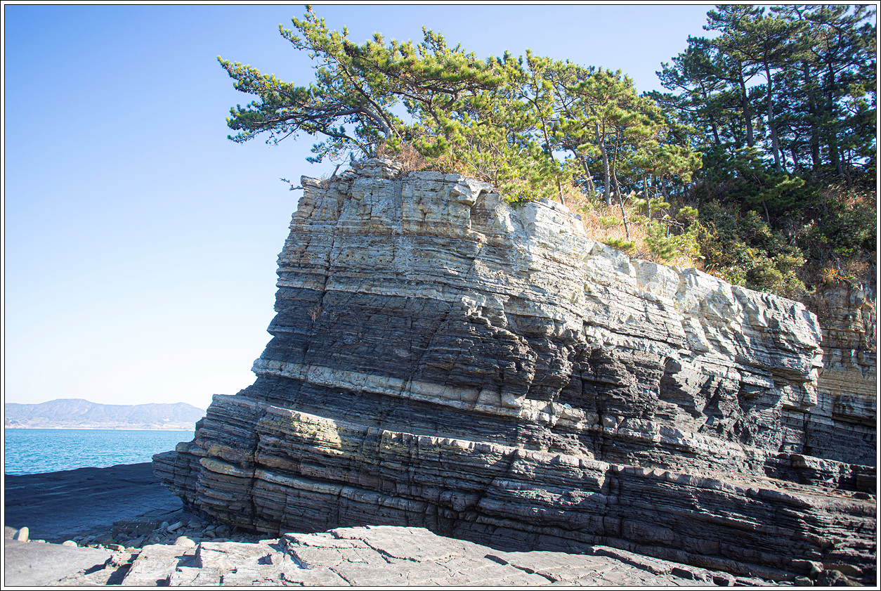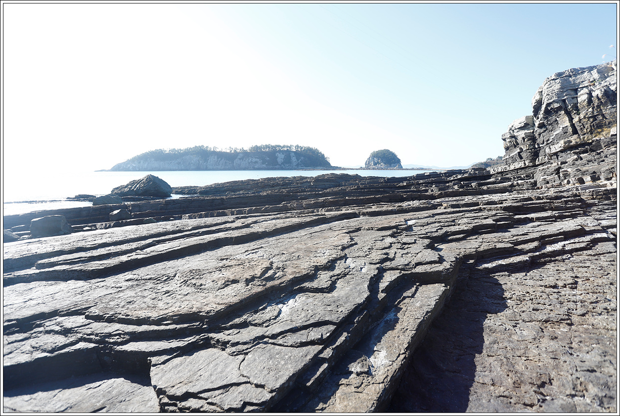 ▽ 마을쪽을 바라 본 풍경으로 섬 해변을 따라 길게 층리를 이룬 퇴적암은 보는 이 마다 감탄을 불러 온다.