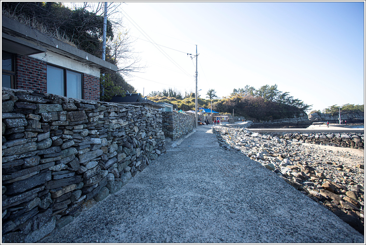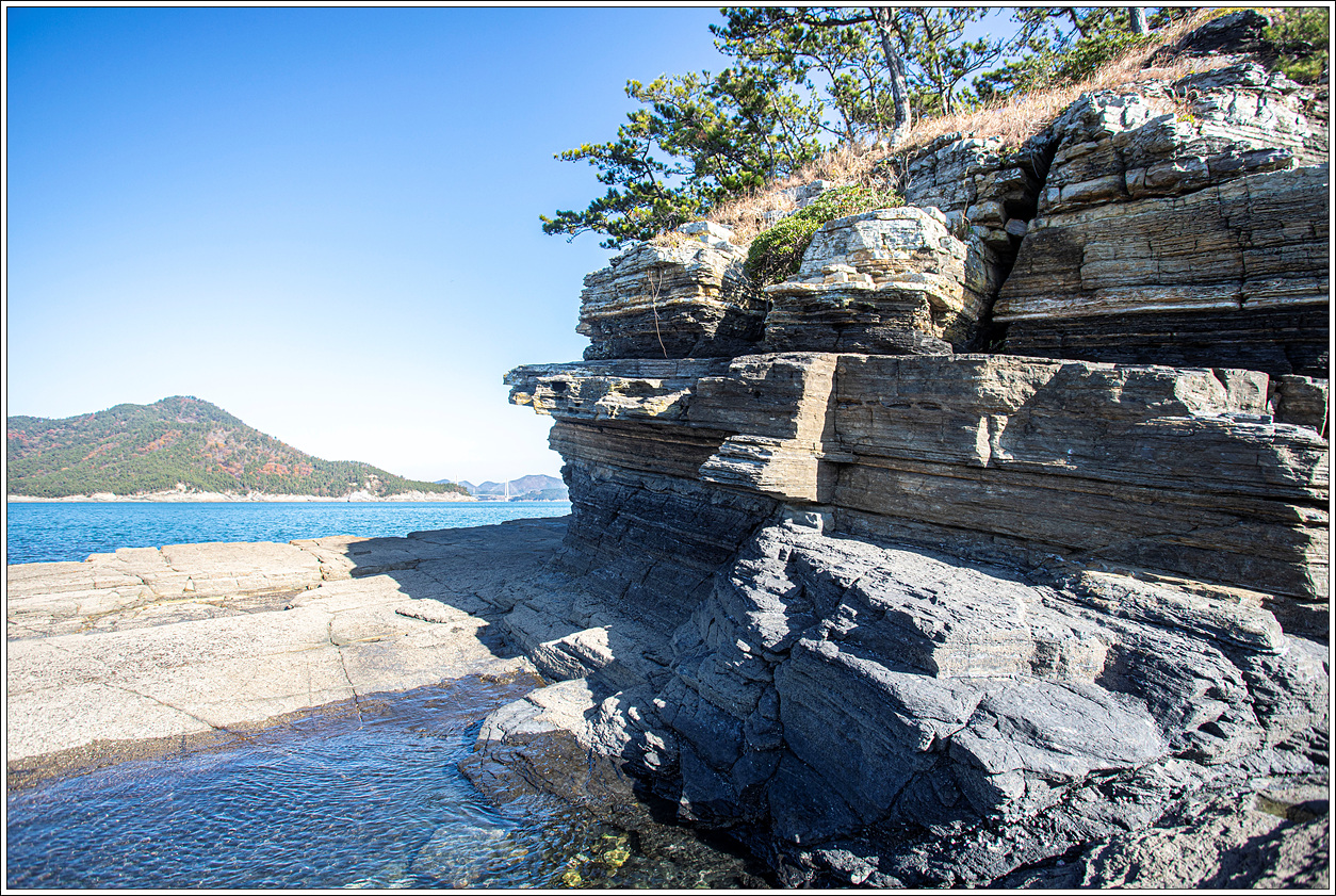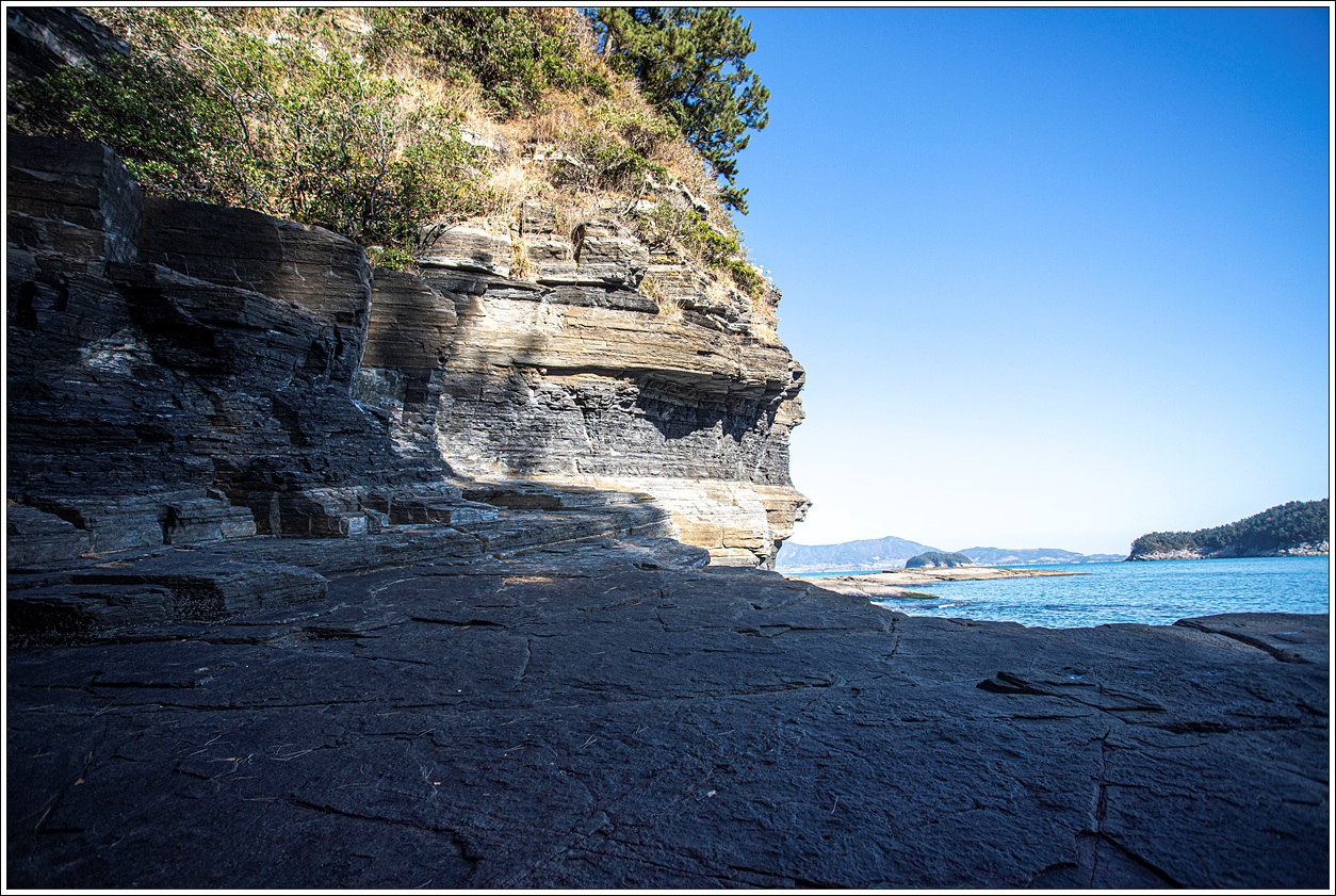▽ 마을쪽을 바라 본 풍경으로 섬 해변을 따라 길게 층리를 이룬 퇴적암은 보는 이 마다 감탄을 불러 온다.