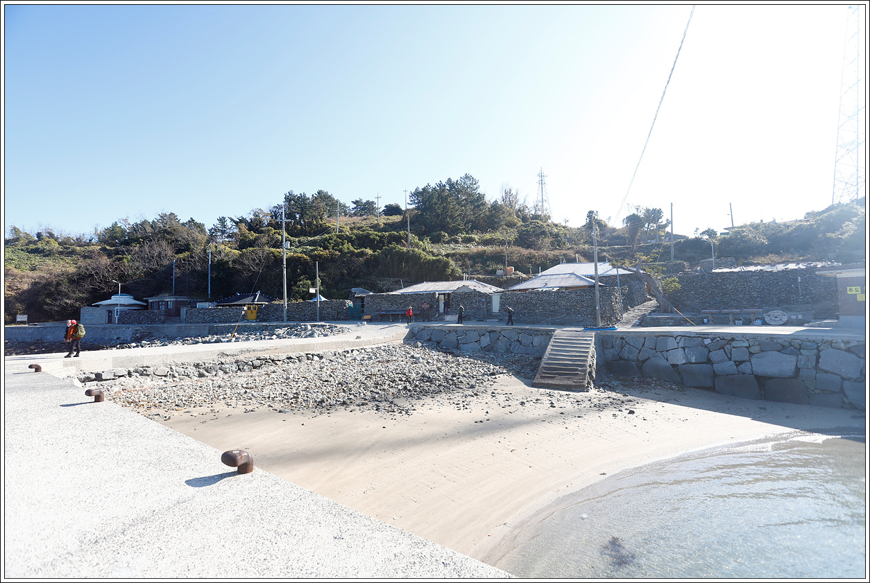 ▽ 선착장에 내리자마자 마을 오른쪽으로 보이는 퇴적층이 해안을 따라 길게 늘어져 있어 신비롭게 느껴진다.