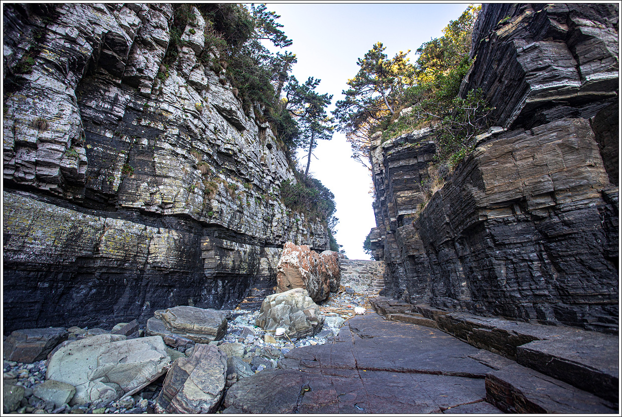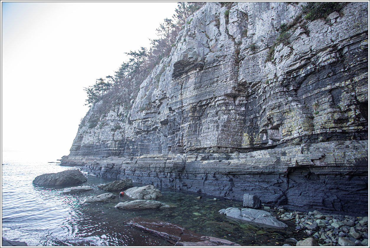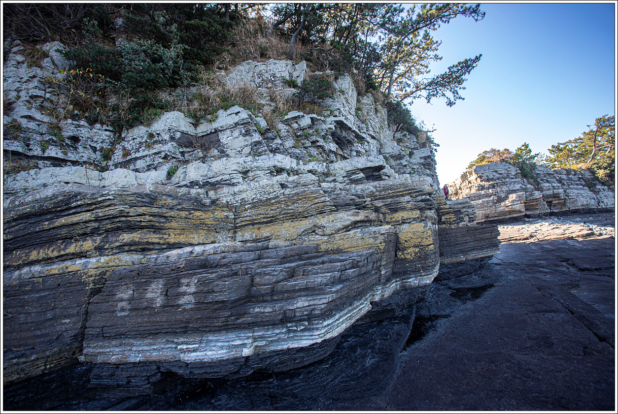 ▽ 아침에 저곳 퇴적층을 걸을 때는 썰물이라 넓은 해안 바닥도 볼 수 있었는데 물이 차올라 잠겨 버렸다.