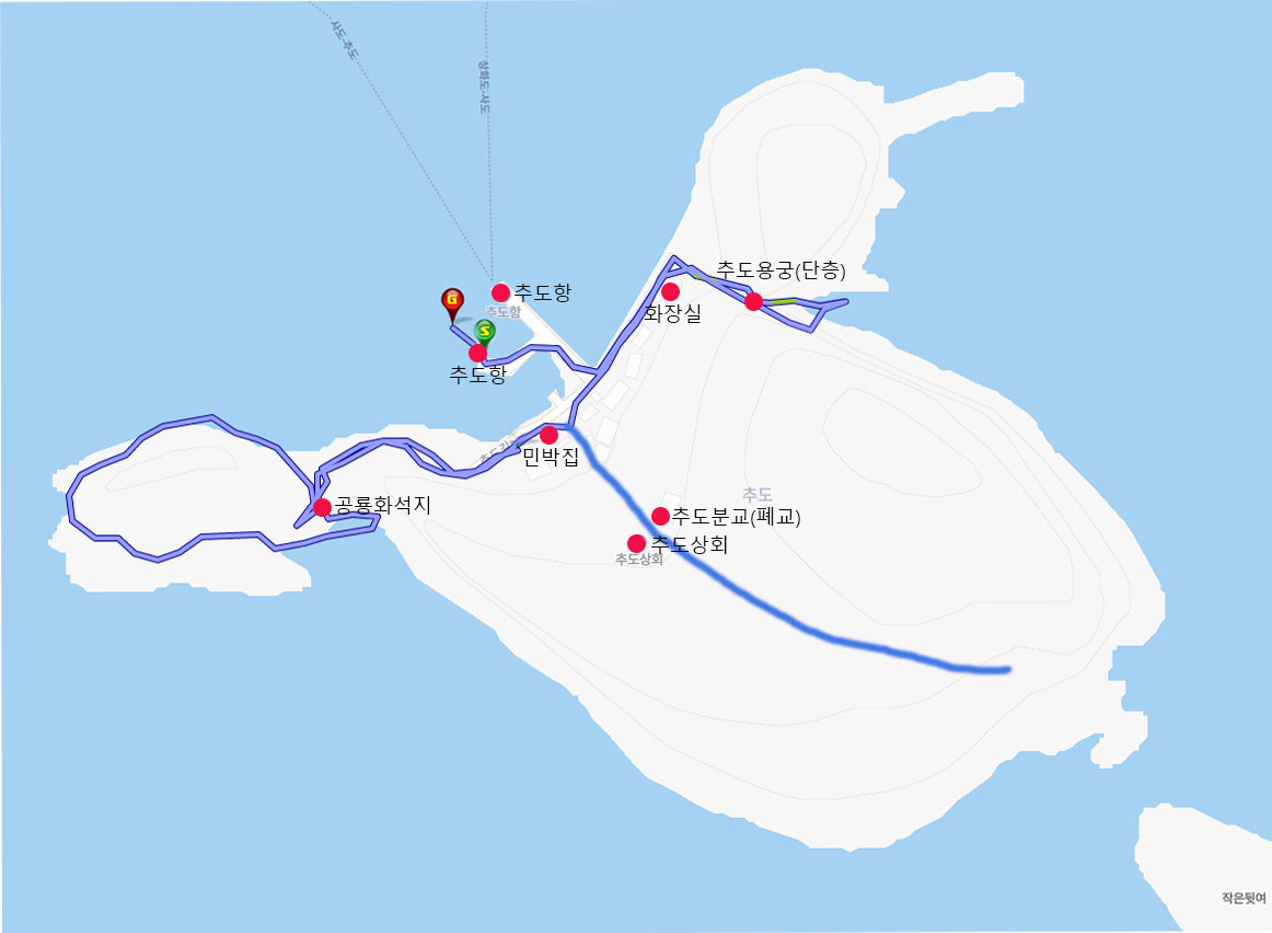 사도에서 예약되어 있는 점심을 먹기 위해서는 먼저 추도를 둘러봐야 하는데 사도선착장에서 하선하여 바로 어선으로 갈아타고 3분 거리인 추도로 가게 된다. 물론 별도의 요금이 지불된다. 추도에서 머물 시간은 걷는 거리가 1km가 채 되지 않아 40여분 밖에 주어지지 않으므로 둘러 보는 곳들의 시간을 잘 할애해야 한다.