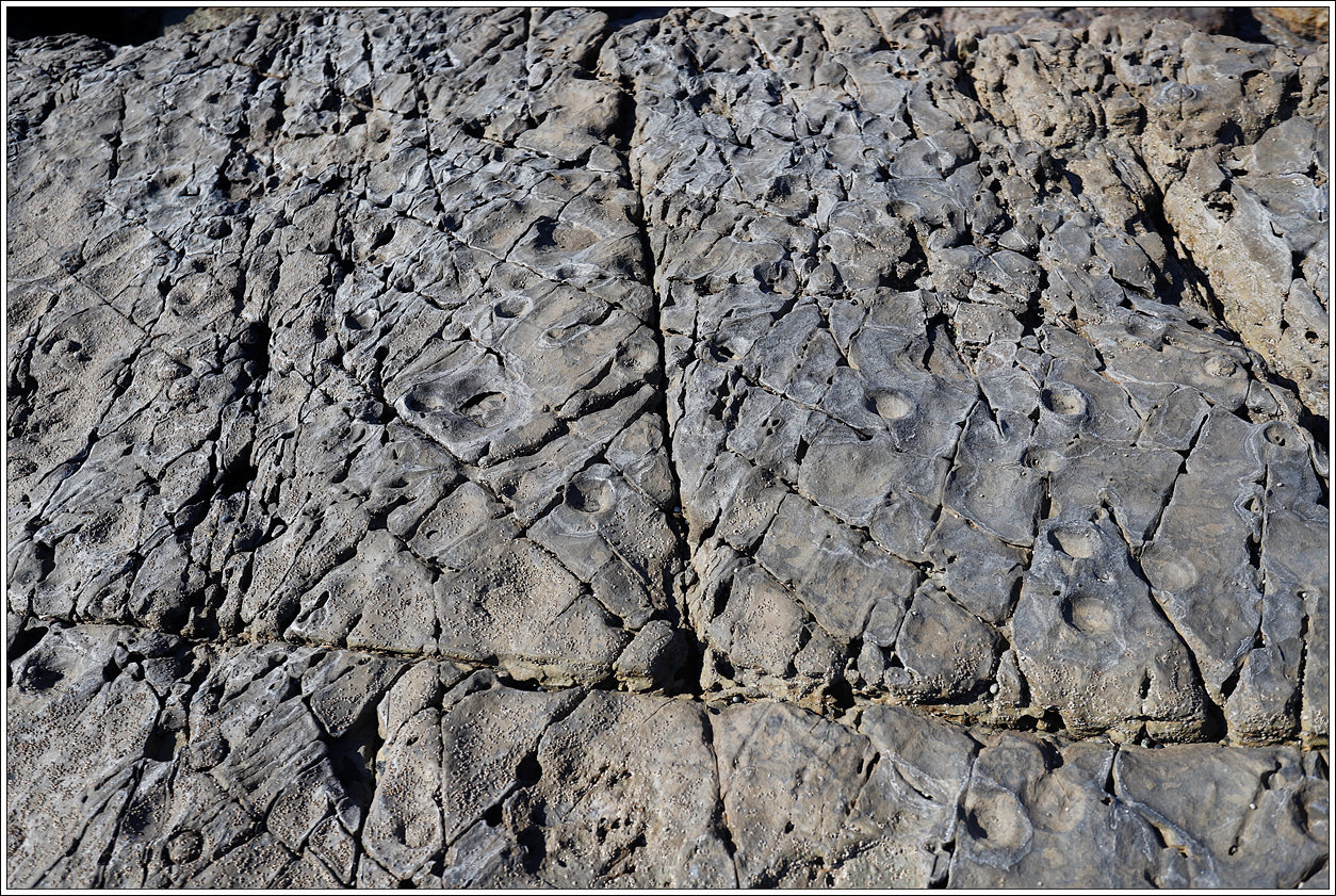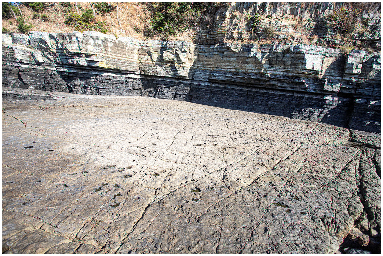 ▽ 추도에서는 공룡발자국 화석외에도 약 7천만 년 전에 만들어진 평행한 퇴적층리와 렌즈상으로 발달된 층리, 그리고 물결 자국, 결핵체 등의 퇴적 구조, 암맥, 차별침식구조 등 여러 지질 특징이 관찰된다.
