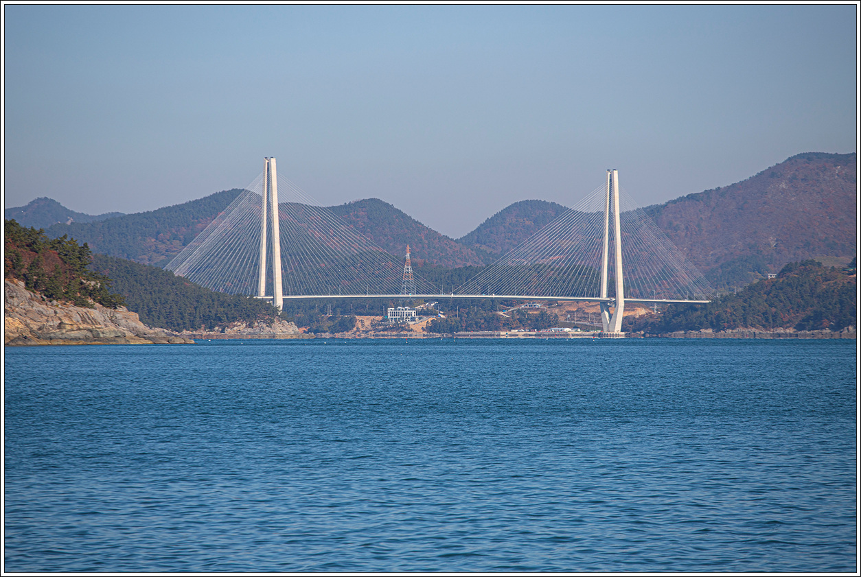 ▽ 멀리 오른쪽 화양면에서 왼쪽 조발도를 연결한 조화대교를 렌즈로 당겨봤다. 여수시에서 이곳으로 오려면 첫 번째 이 대교를 건너게 되고 조발도에서 둔병도와 연결한 둔병대교를 두 번째로 건너고 세 번째 둔병도에서 낭도를 연결한 낭도대교를 건너게 되어 마지막 낭도선착장을 이용하게 된다.