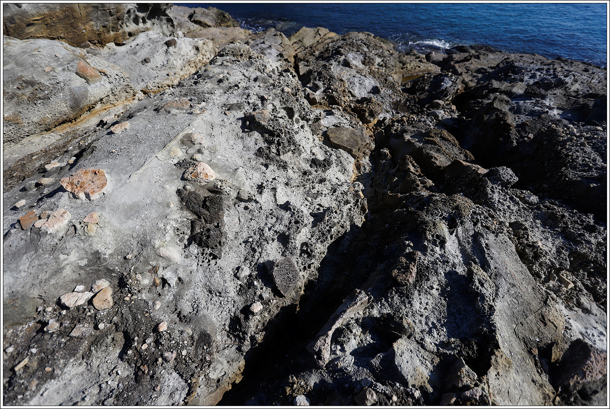 ▽ 화산이 분출하여 퇴적된 퇴적물이 암석으로 변한 응회암층으로 이루어져 있다고 한다.