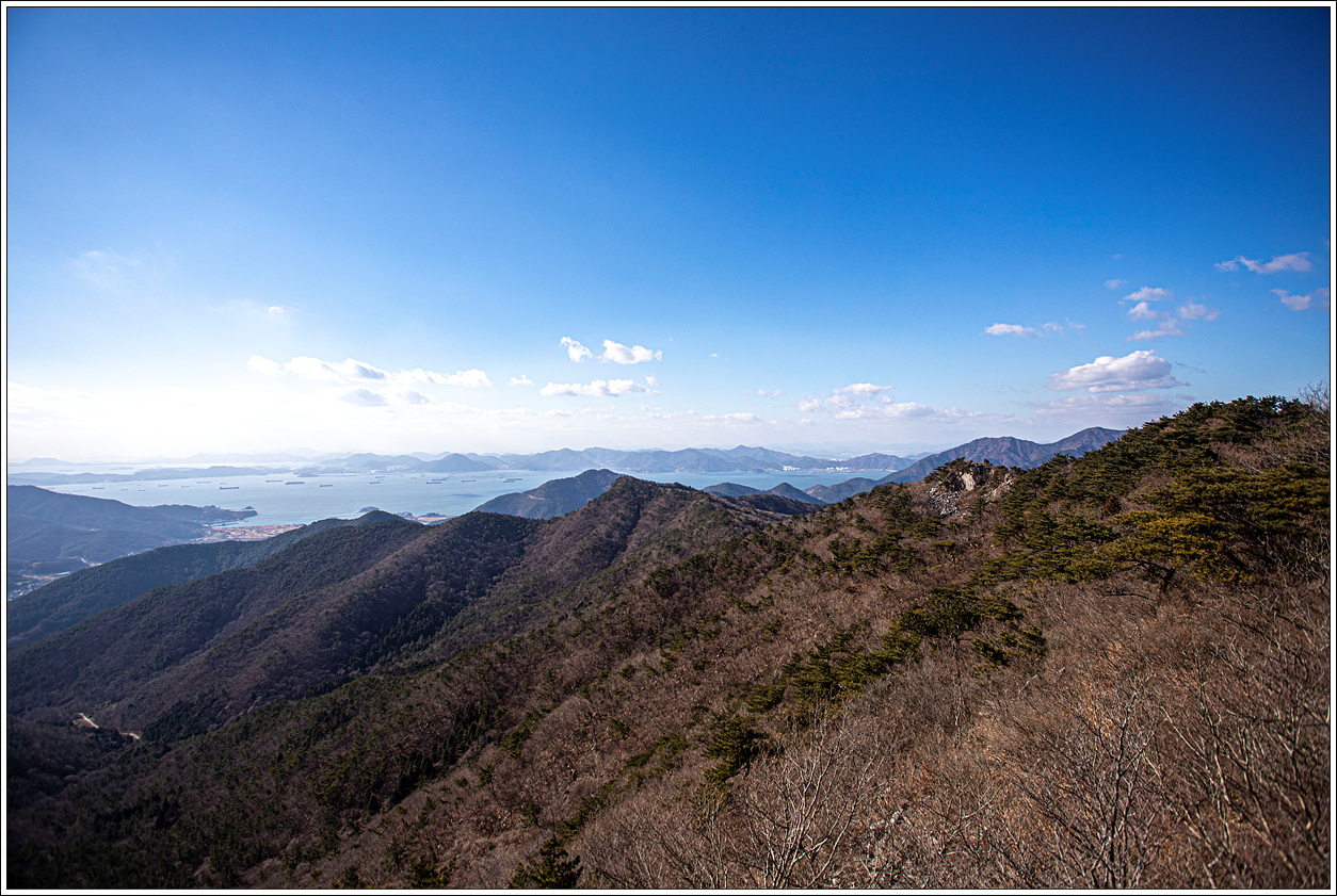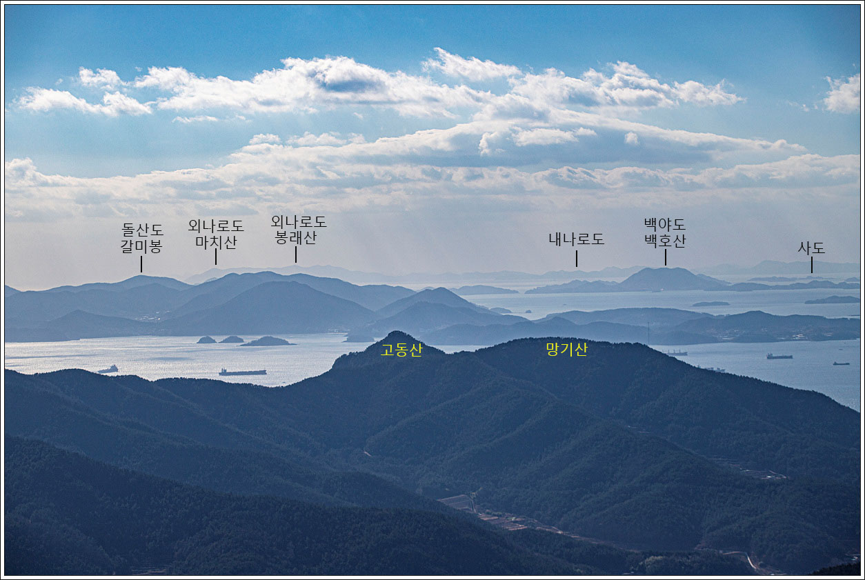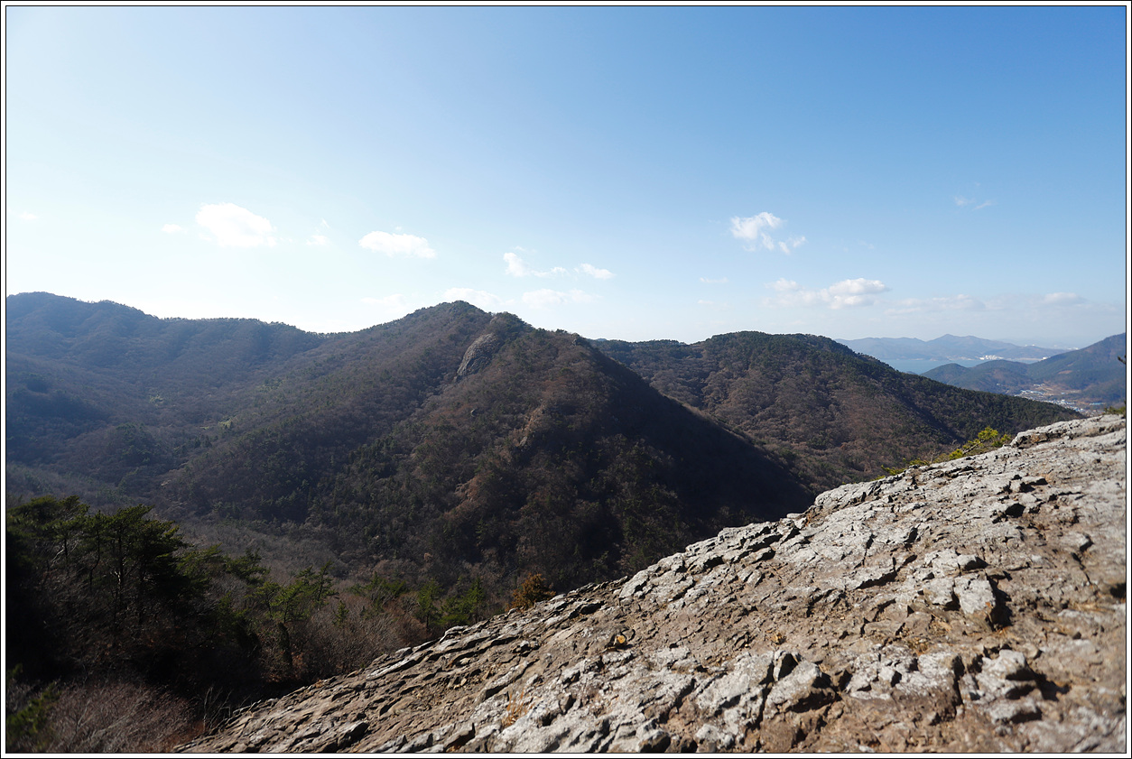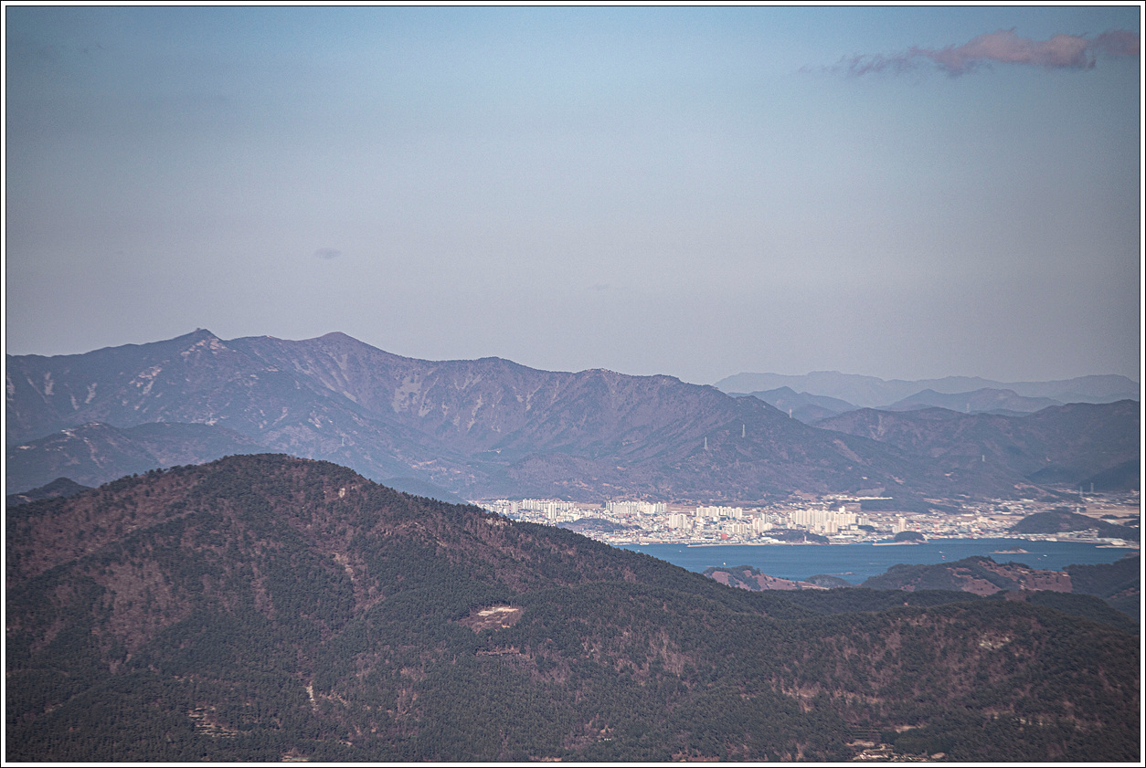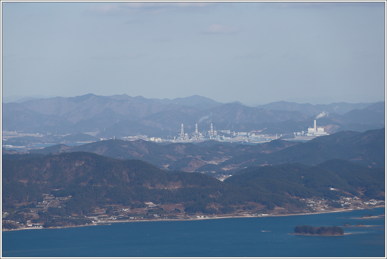 ▽ 왼쪽 멀리 삼천포화력발전소와 그 바로 오른쪽으로 좌이산, 그 멀리에 뾰족한 거류산, 가운데 멀리 뾰족한 벽방산, 오른쪽 끝으로 살짝 사량도의 지리망산이 보인다.