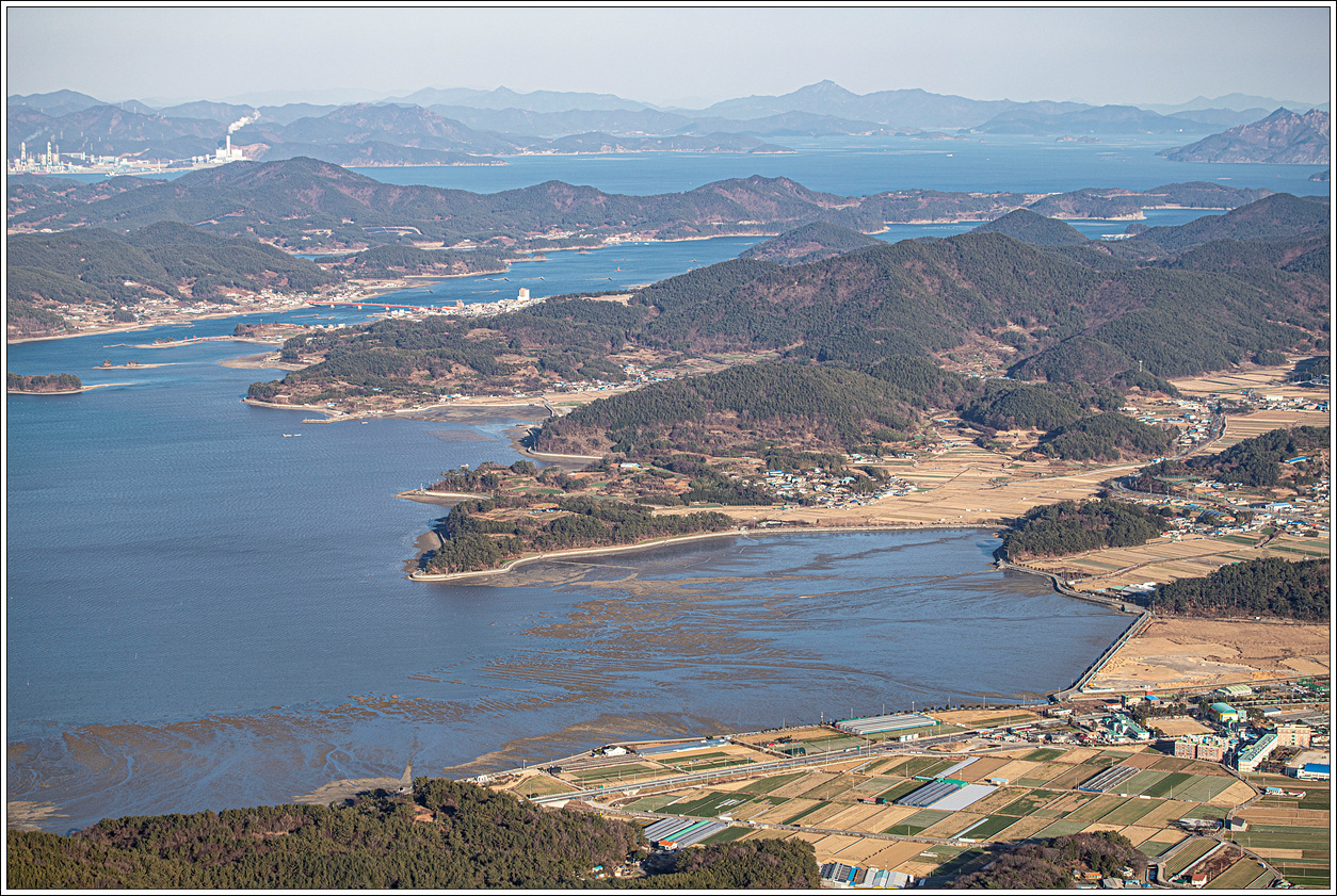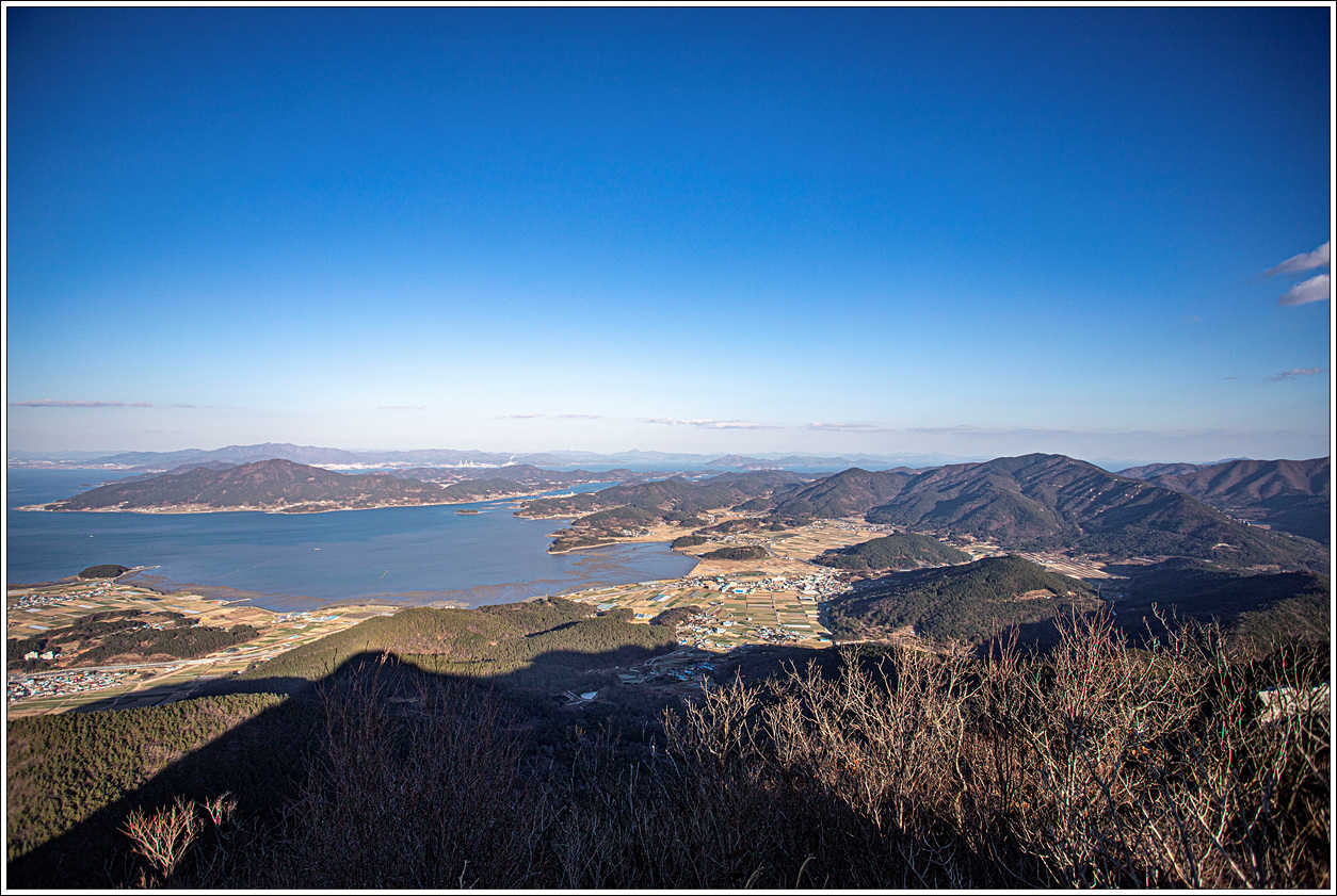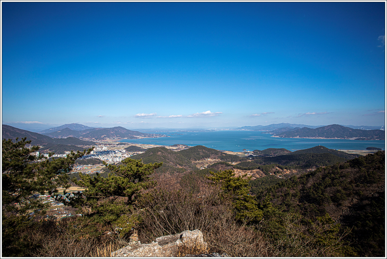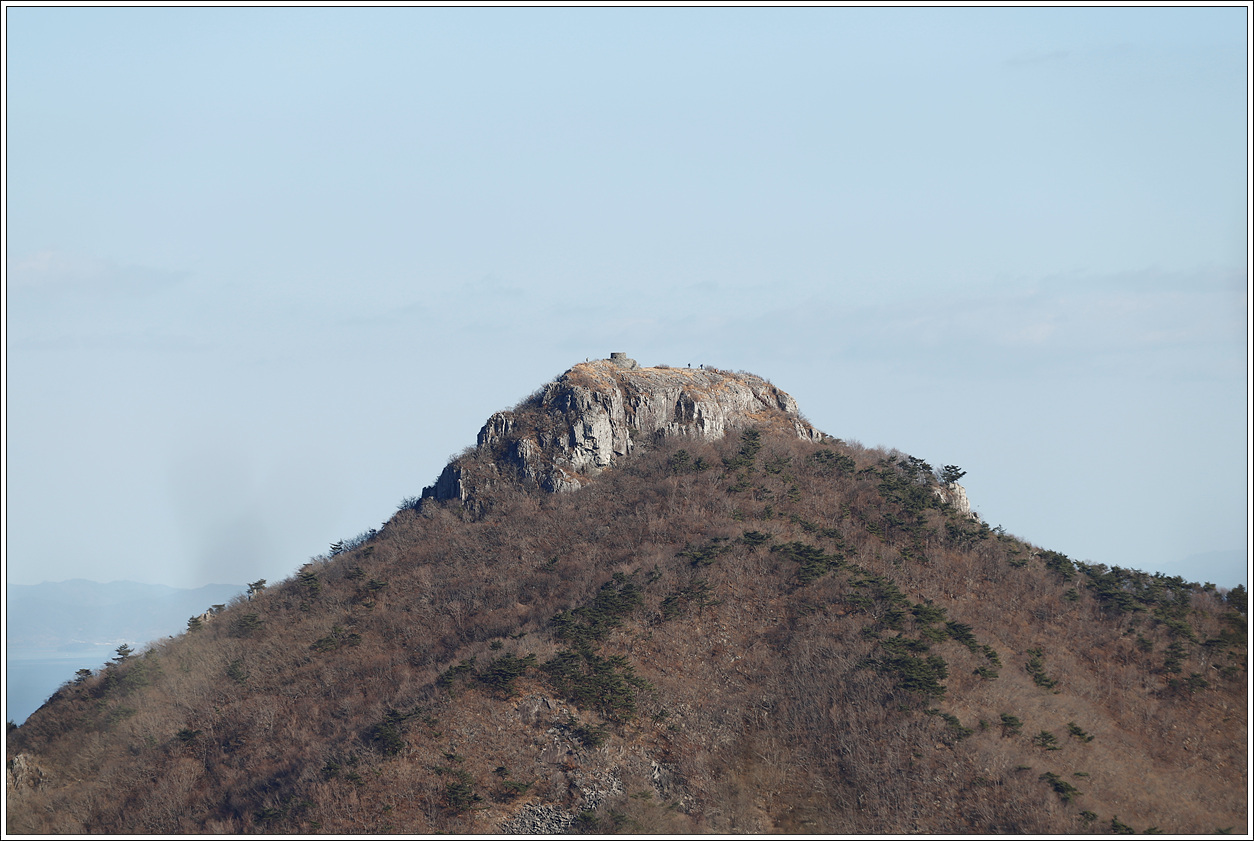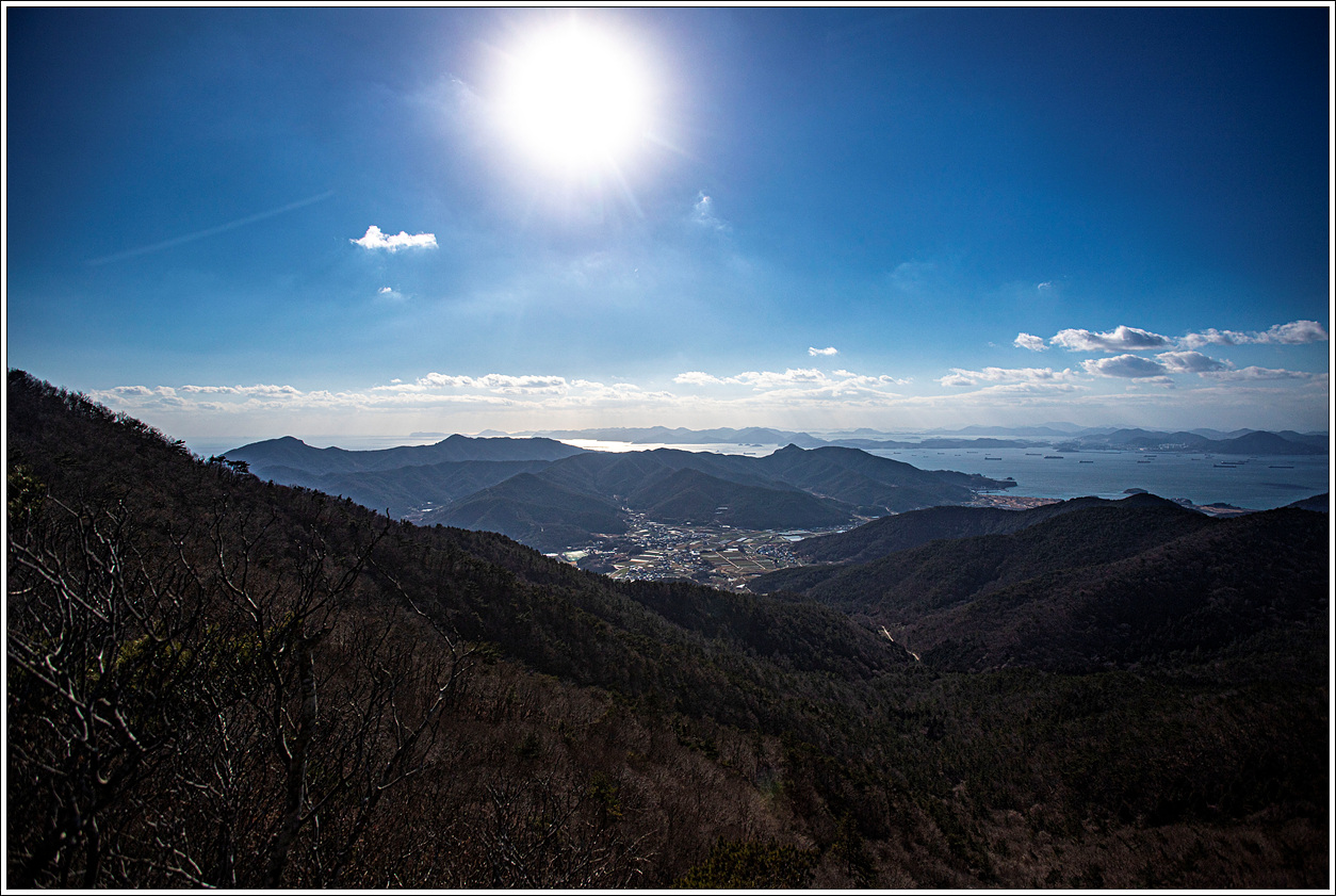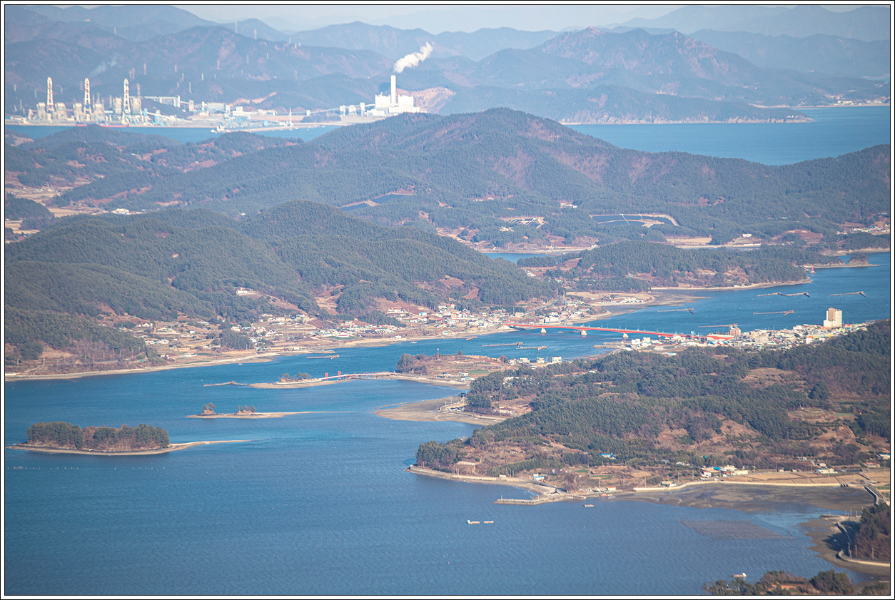 ▽ 왼쪽 멀리 삼천포화력발전소와 그 바로 오른쪽으로 좌이산, 그 멀리에 뾰족한 거류산, 가운데 멀리 뾰족한 벽방산, 오른쪽 끝으로 살짝 사량도의 지리망산이 보인다.