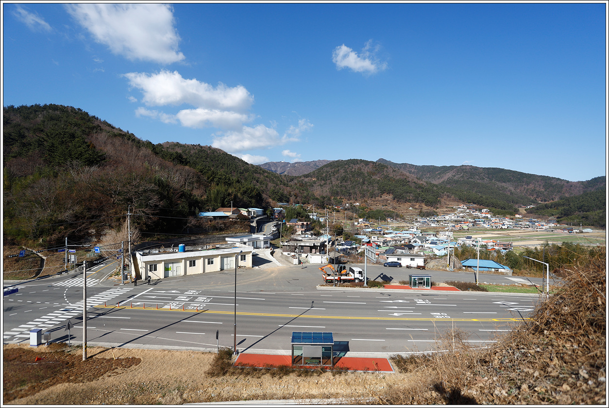 ▽ 버스 정류장 건너편 공터에 주차를 하고 들머리에 살짝 올라서니 평현리 마을 전경이 평화스럽게 보인다. 동산 뒤쪽으로 멀리 남해의 망운산이 보인다.