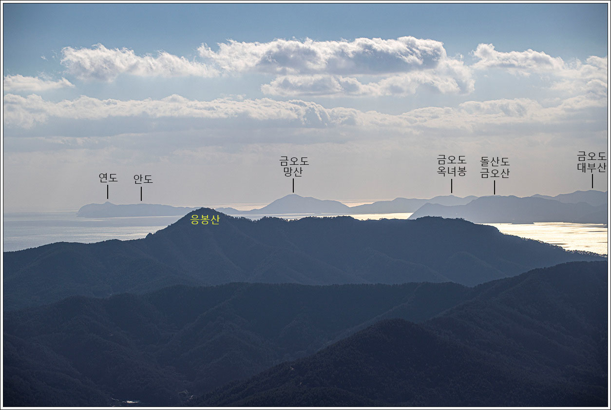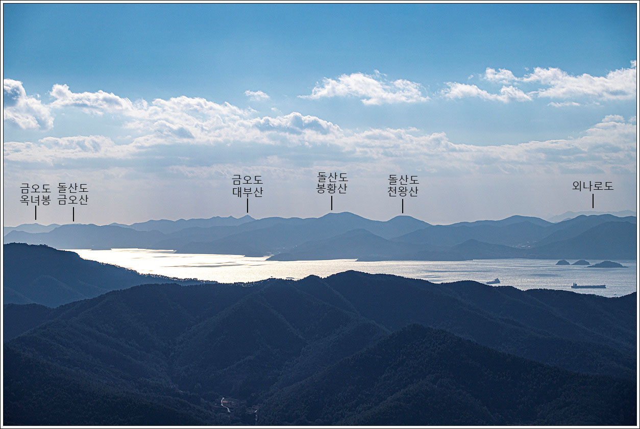 ▽ 여수의 남면 끝자락인 연도로 부터 오른쪽 금오도의 대부산... 금오도에 금오산이 있는게 아니라 돌산도에 금오산 명칭이 있다는게 헷갈리기 쉽다. 바로 앞쪽으로 보이는 응봉산은 설흘산과 같이 연결된 산이다.
