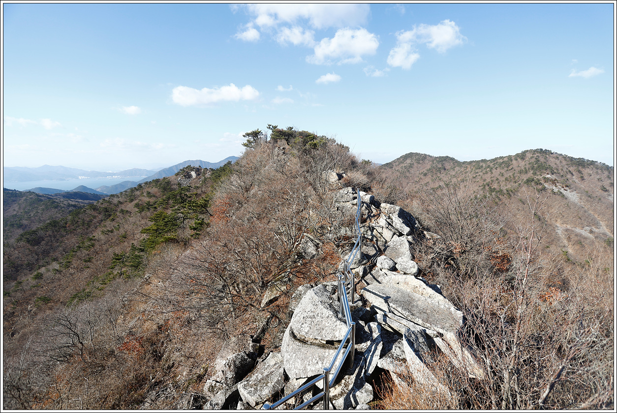 ▽ 등로에서 살짝 벗어나 북쪽 방향을 조망해 보는데 왼쪽 멀리 하동의 금오산이 보이고 오른쪽으로 창선도 대방산과 그 뒤로 사천의 와룡산이 보인다. 앞으로 괴음산, 송등산, 호구산으로 걸으면서 내내 볼 풍경이다.