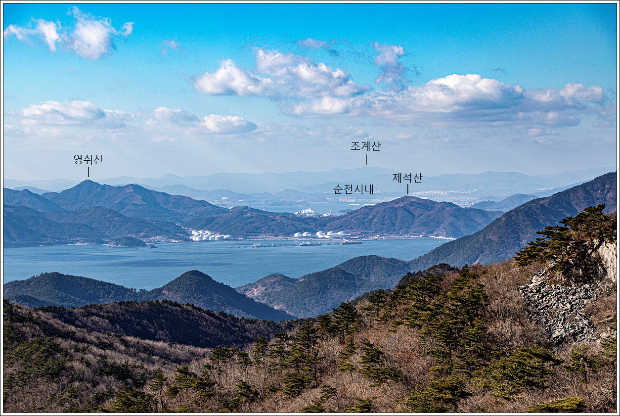 ▽ 여수에 알려진 호랑산과 영취산... 그 멀리에 보성의 초암산과 존제산들이 아련하게 보인다.