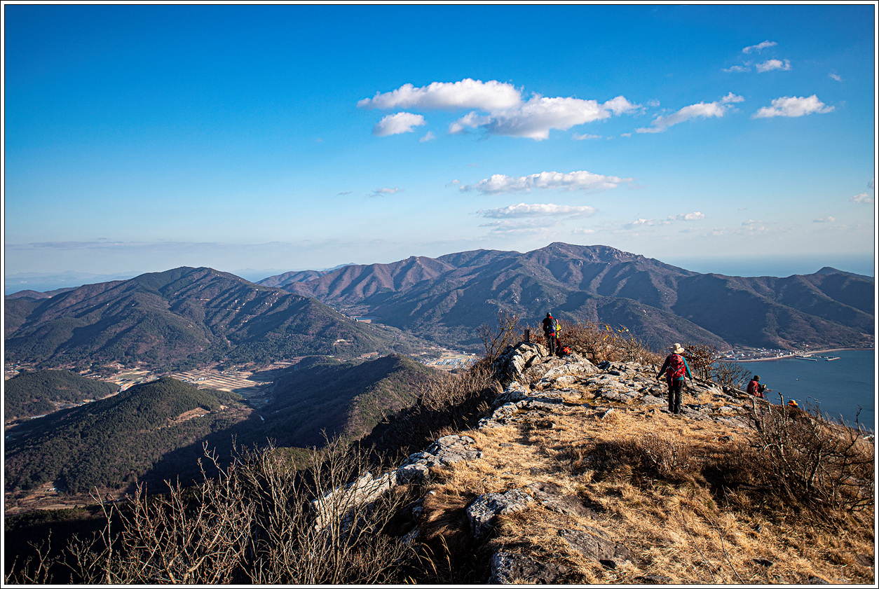 ▽ 송등산 정상에서도 자칫 잡목이 있다면 남쪽 방향의 풍경을 담지 못할 수도 있다는 생각에 산행에 뒤쳐지더라도 이곳에서 자세히 주변 지형을 담아 보기로 한다. 멀리 설흘산이 보이고 그 뒤로 왼쪽 끝 연도로 부터 금오도, 돌산도, 여수시내까지 조망된다.