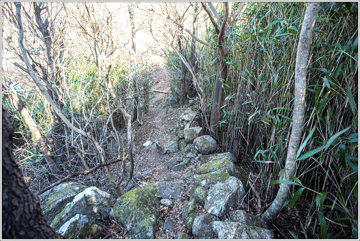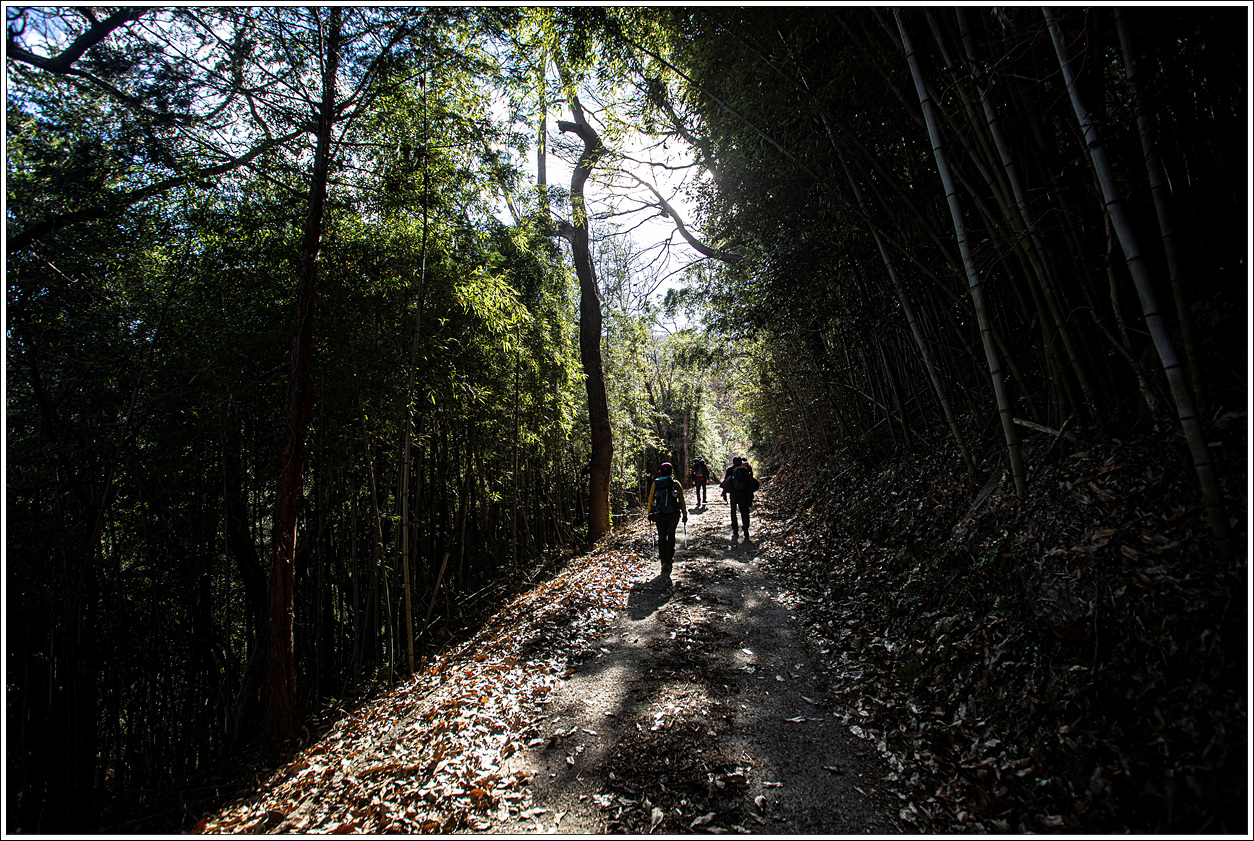 ▽ 다시 하산하듯 가파른 능선을 내려오니 대나무숲이 있는 임도를 만나게 되고...