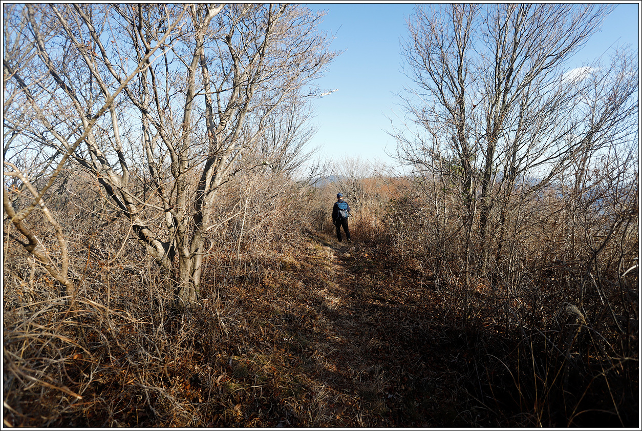 ▽ 드디어 호구산 정상의 암릉을 우회하는 갈림길에 왔다. 이곳에서 왼쪽으로 소사나무숲을 지나가게 된다.