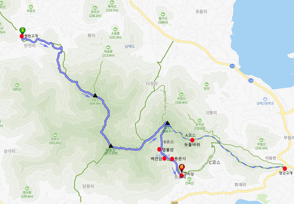 ♣ 소재지: 들머리-경남 남해군 남해읍 평현리 1249-3(평현고개), 호구산 정상-남해군 이동면 다정리, 날머리-남해군 이동면 용소리 983-3 (주차장)